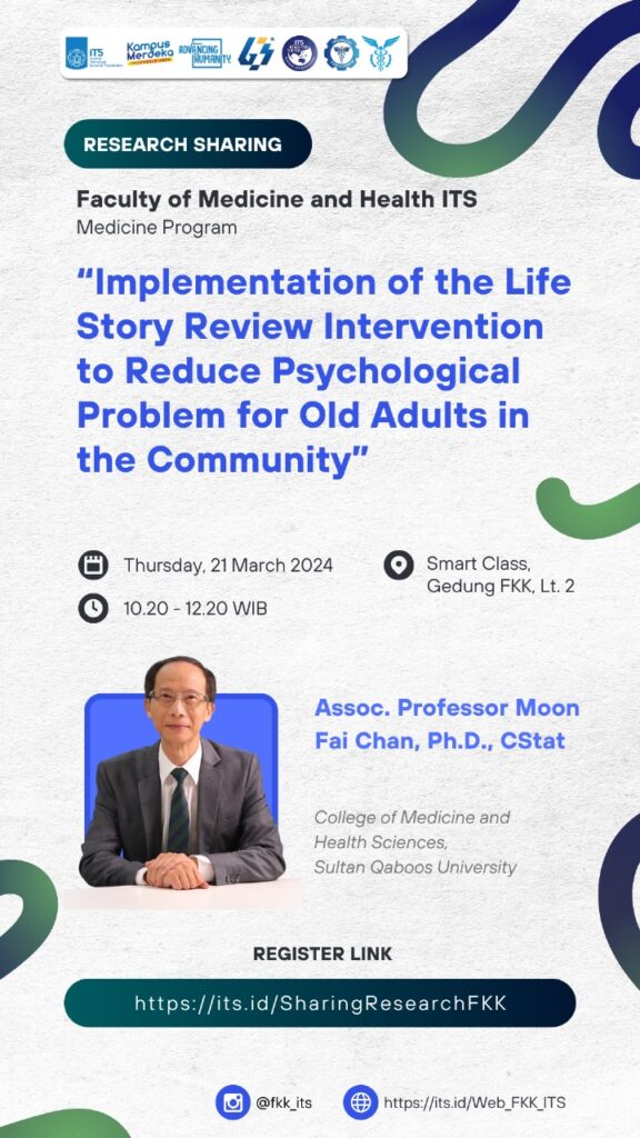Halo sobat Medics! Yuk Hadiri acara Research Sharing “Implementation of The Life Story Review Intervention to Reduce Psychological Problem for Old Adults in the Community” bersama dengan Assoc. Prof. Moon Fai Chan., Ph.D., CStat.