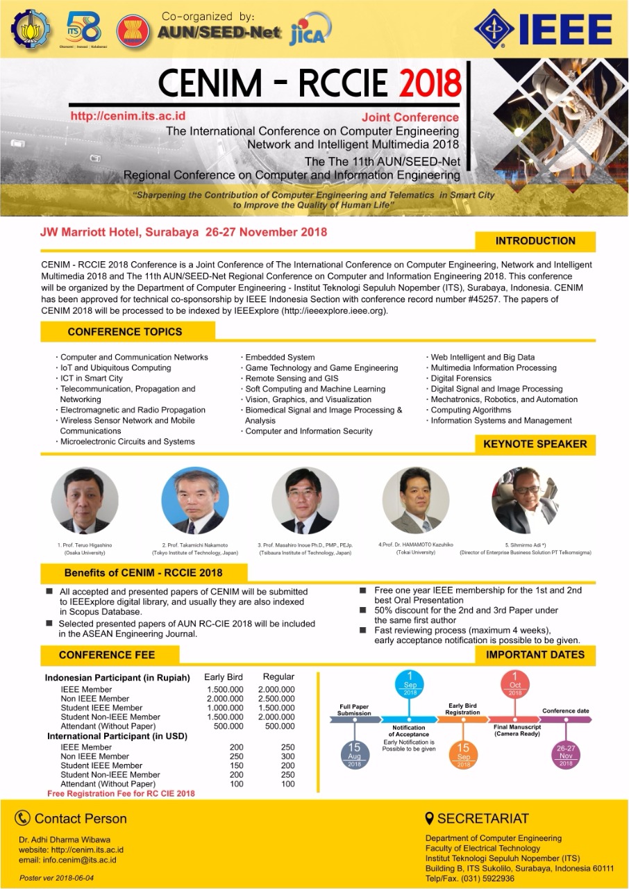 Department of Computer Engineering, ITS, will have an International Conference called CENIM (International Conference on Computer Engineering, Network, and Intelligent Multimedia) which is technically co-sponsored by IEEE. This conference will be held jointly with RCCIE of AUN/SEED.Net (11th AUN/SEED Regional Conference on Computer and Information Engineering) in J.W. Marriot Hotel, Surabaya, East Java, Indonesia.
