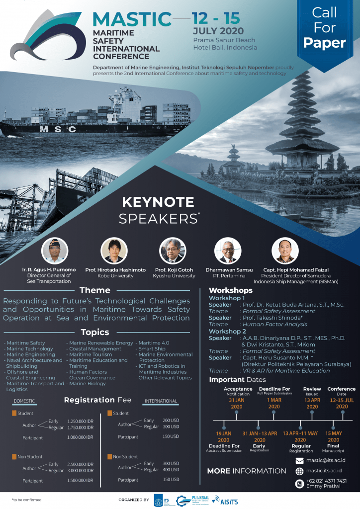 Department of Marine Engineering, Institut Teknologi Sepuluh Nopember, proudly presents the 2nd International Conference about maritime safety and technology. MASTIC (Maritime Safety International Conference) 2020 will be held from 12th to 15th July 2020 in Bali, Indonesia.