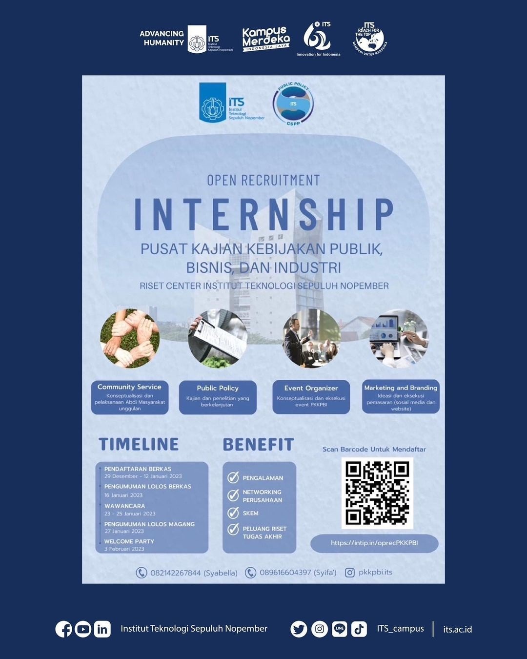 Ambil kesempatanmu untuk berkembang, belajar, dan berkarir di Pusat Kajian Kebijakan Publik Bisnis dan Industri (PKKPBI) ITS. Kesempatan ini terbuka bagi seluruh mahasiswa ITS jenjang S1 maupun S2 seluruh departemen. Program internship ini menawarkan benefit berupa: