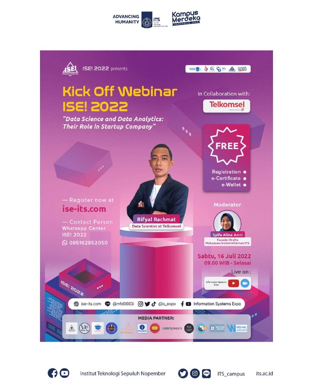 Sebagai pengawal dari seluruh rangkaian acara tahun ini, ISE! 2022 mengadakan Kick-Off Webinar dengan tema “Data Science and Data Analytics: Their Role in Startup Companies”. Bersama pembicara yang menarik dan tentunya berpengalaman, diharapkan webinar ini bisa memberimu wawasan baru mengenai pentingnya pengolahan data pada suatu startup. Catat tanggalnya, ya!