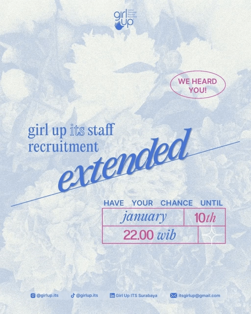 Girl Up ITS is extending the staff recruitment process until Tuesday, 10 January 2023 at 22.00 WIB‼️