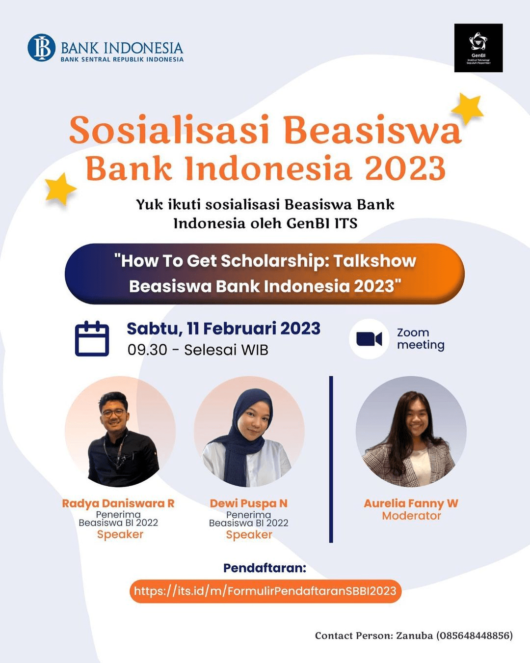 Karenanya, kami mengajak Sobat pejuang beasiswa untuk mengetahui lebih lanjut motivasi, kiat-kiat, dan informasi terkait beasiswa Bank Indonesia pada acara SOSIALISASI BEASISWA BANK INDONESIA 2023 yang akan dilaksanakan pada :