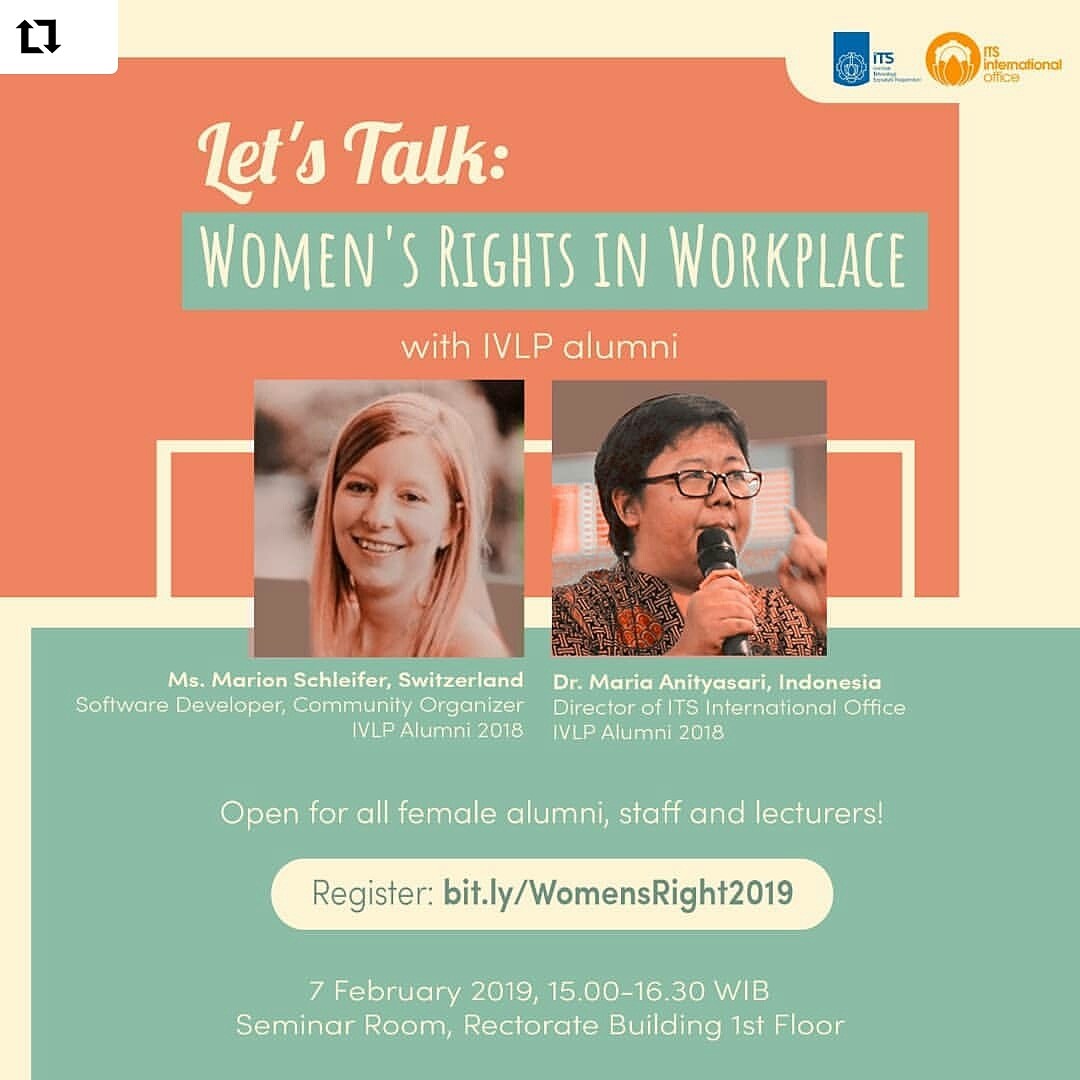 Calling out all the marvelous women out there! Let’s talk with International Visitor Leadership Program (IVLP) alumni, Ms. Marion Scleifer and Dr. Maria Anityasari about Women’s Rights in Workplace on 7 February 2019 from 15.00 – 16.30 WIB at Seminar Room, Rectorate Building 1st floor.