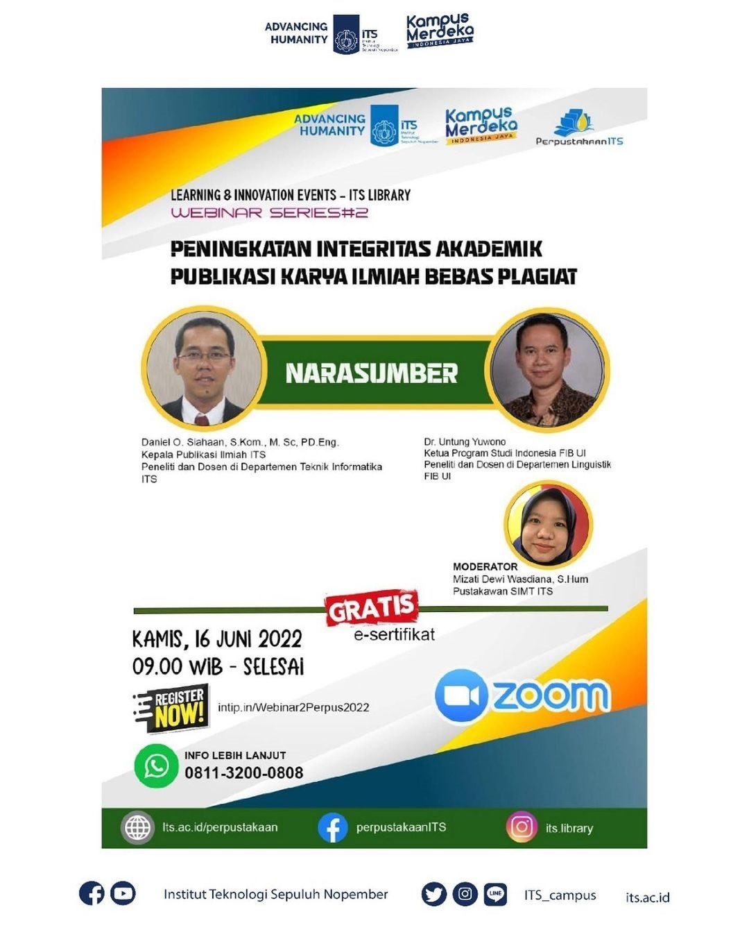 NARASUMBER: 1. Daniel O. Siahaan, S.Kom., M. Sc, PD.Eng. (Kepala Publikasi Ilmiah ITS, Peneliti, dan Dosen di Departemen Teknik Informatika, ITS) 2. Dr. Untung Yuwono (Ketua Program Studi Indonesia FIB UI,Peneliti, dan Dosen di Departemen Linguistik, FIB UI)