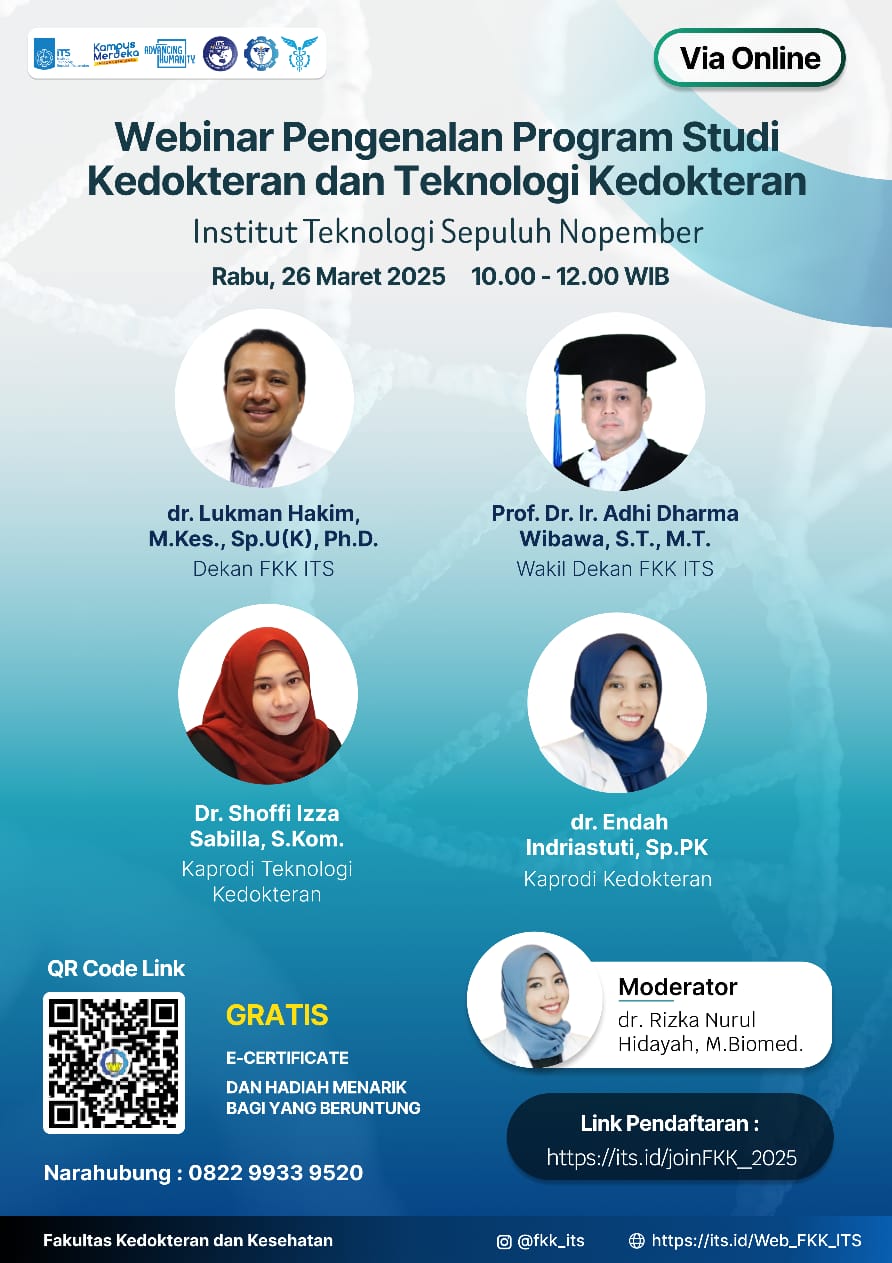 Untuk menjawab rasa penasaran kalian semua, FKK kembali menghadirkan Webinar Pengenalan Program Studi Kedokteran dan Teknologi Kedokteran ITS yang akan dilaksanakan pada: