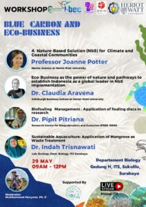 Pada tanggah 29 Mei pukul 09.00-12.00 WIB sudah dilaksanakan workshop dengan tema “Blue Carbon and Eco-Business”. Workshop yang di moderatori oleh Bpk. Mukhammad Muryono, Ph.D ini mengundang 4 pembicara keren dari Indonesia dan mancanegara. Keempat pembicara tersebut adalah Professor Joanne Potter dari Marine Science at Hariot-watt University dengan tema “A Nature-Based Solution (NbS) for Climate and Coastal Communities”; Dr. Claudia Aravena dari Edinburgh Business School at Heriot-Watt University dengan tema “Eco-Business as the Power of Nature and Pathway to Establish Indonesia as a Global Leader in NbS”; Dr. Pipit Pitriana dari Research Centre for Biosystematics and Evolution (PRBE-BRIN) dengan tema “Biofouling Management: Application of Fouling Discs in Research”; dan Dr. Indah Trisnawati dengan tema “Sustainable Aquaculture: Application of Mangrove as Waste Treatment”.