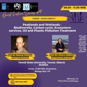 Telah diadakan Guest Lecture Series #1 di H-307-308 Smartclass Departemen Biologi ITS pada tanggal 26 Mei 2023. Kuliah tamu kali ini bertemakan Biodiversity dengan judul Peatlands and Wetlands: Biodiversity, Carbon cycle, Ecosystem services, Oil and Plastic Pollution Treatment.