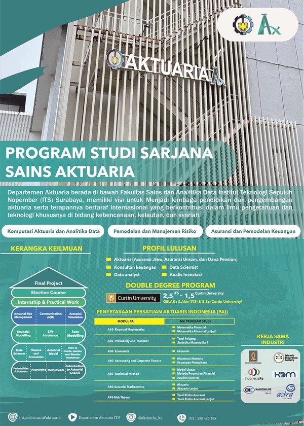 Program seleksi penerimaan mahasiswa Departemen Aktuaria dikelola secara terpadu oleh Biro Administrasi Pembelajaran dan Kesejahteraan Mahasiswa (BAPKM). Informasi selengkapnya, silahkan kunjungi laman ini.