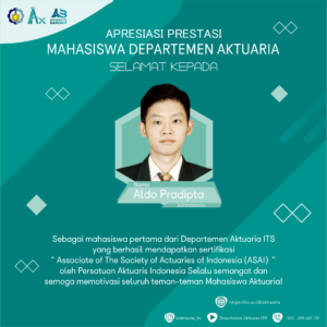 Sebagai mahasiswa pertama dari Departemen Aktuaria ITS yang berhasil mendapatkan sertifikasi ‘Associate of The Society of Actuaries of Indonesia (ASAI)’ oleh Persatuan Aktuaris Indonesia Selalu semangat dan semoga memotivasi seluruh teman-teman Mahasiswa Aktuaria!