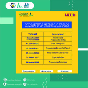 Event ini akan dilaksanakan secara online dengan jadwal sebagai berikut: ðPendaftaran & Pengumpulan Berkas : 1 Desember 2021 – 10 Januari 2022 ðBatas Pembayaran : 12 Januari 2022 ðPengumpulan Full Paper : 15 Januari 2022 ðPengumuman 10 Finalis : 20 Januari 2022 ðPenjurian Online : 25 Januari 2022