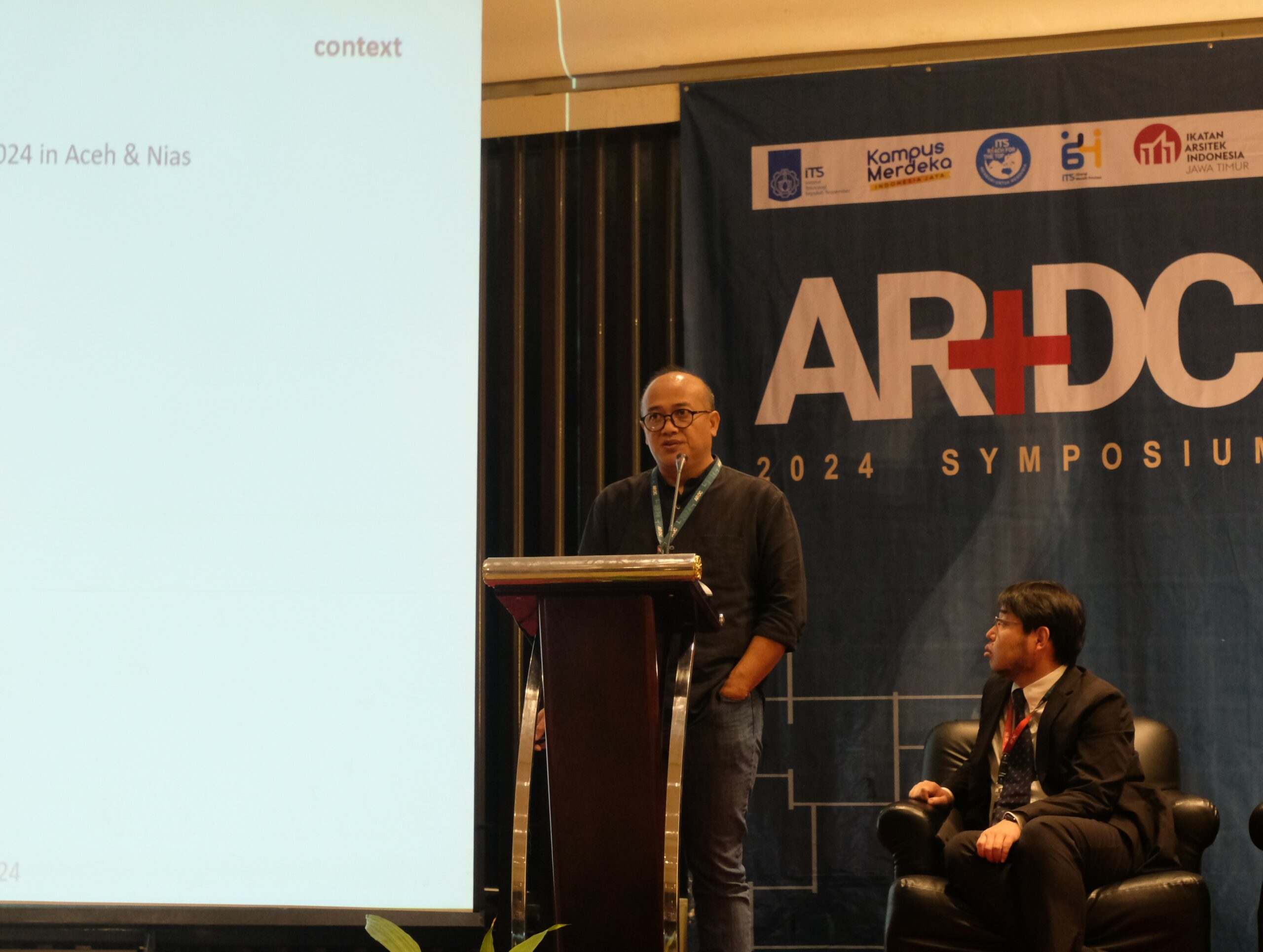 Dosen Departemen Arsitektur ITS Wahyu Setiawan ST MT saat menyampaikan materi mengenai pembangunan bagi masyarakat rentan yang terdampak bencana