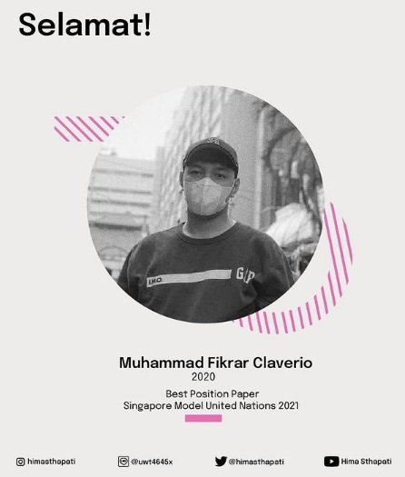 Selamat kepada Muhammad Fikrar Claverio telah meraih Best Position Paper yang diadakan oleh Singapore Model United Nations 2021. Semangat terus dan semoga bisa memotivasi mahasiswa lainnya untuk berprestasi