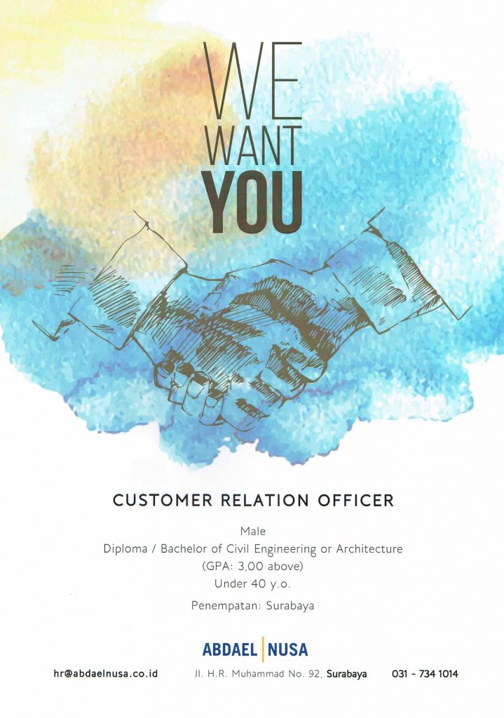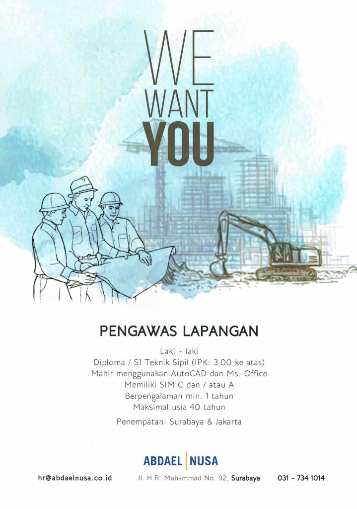 PT. Abdael Nusa saat ini sedang membutuhkan beberapa karyawan untuk posisi Project Architect, Estate Management Staff, Customer Relation Officer dan Pengawas Lapangan informasi lengkap berada di poster berikut