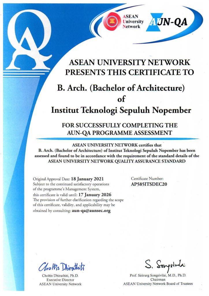Departemen Arsitektur ITS telah diakui oleh Asean University Network (AUN-QA). Hal ini berarti Departemen Arsitektur ITS telah diakui memiliki kualitas setara dengan tingkat ASEAN.