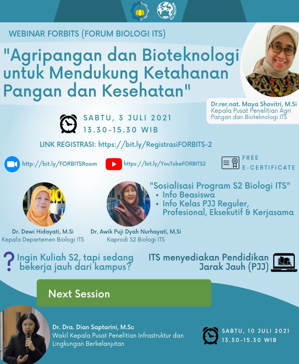 Narasumber: Dr. Dewi Hidayati, M.Si. (Kepala Departemen Biologi) Dr. Awik Puji Dyah Hurhayati, M.Si. (Kaprodi S2) Dr.rer.nat. Maya Shovitri, M.Si. (Kepala Pusat Penelitian Agri-Pangan dan Bioteknologi – DRPM ITS)