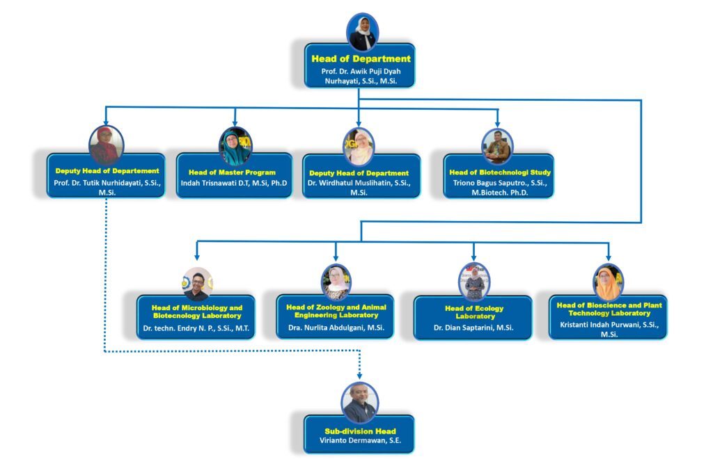 Dalam menjalankan kegiatan operasionalnya DIS-ITS telah membentuk struktur organisasi yang kompatibel dengan struktur organisasi ITS. Dalam pelaksanaan program DIS-ITS, Kepala Departemen dibantu oleh Sekretaris Departemen, Kepala dan Sekretaris program sarjana (S1), Kepala dan Sekretaris program pasca master (S2), kepala laboratorium yang bertanggung jawab atas Kepemimpinan Operasional di Laboratorium dan Kepala staf non akademik (Kasubag TU) yang membantu dalam Sumber Daya Keuangan. Dalam melakukan kegiatan akademik.