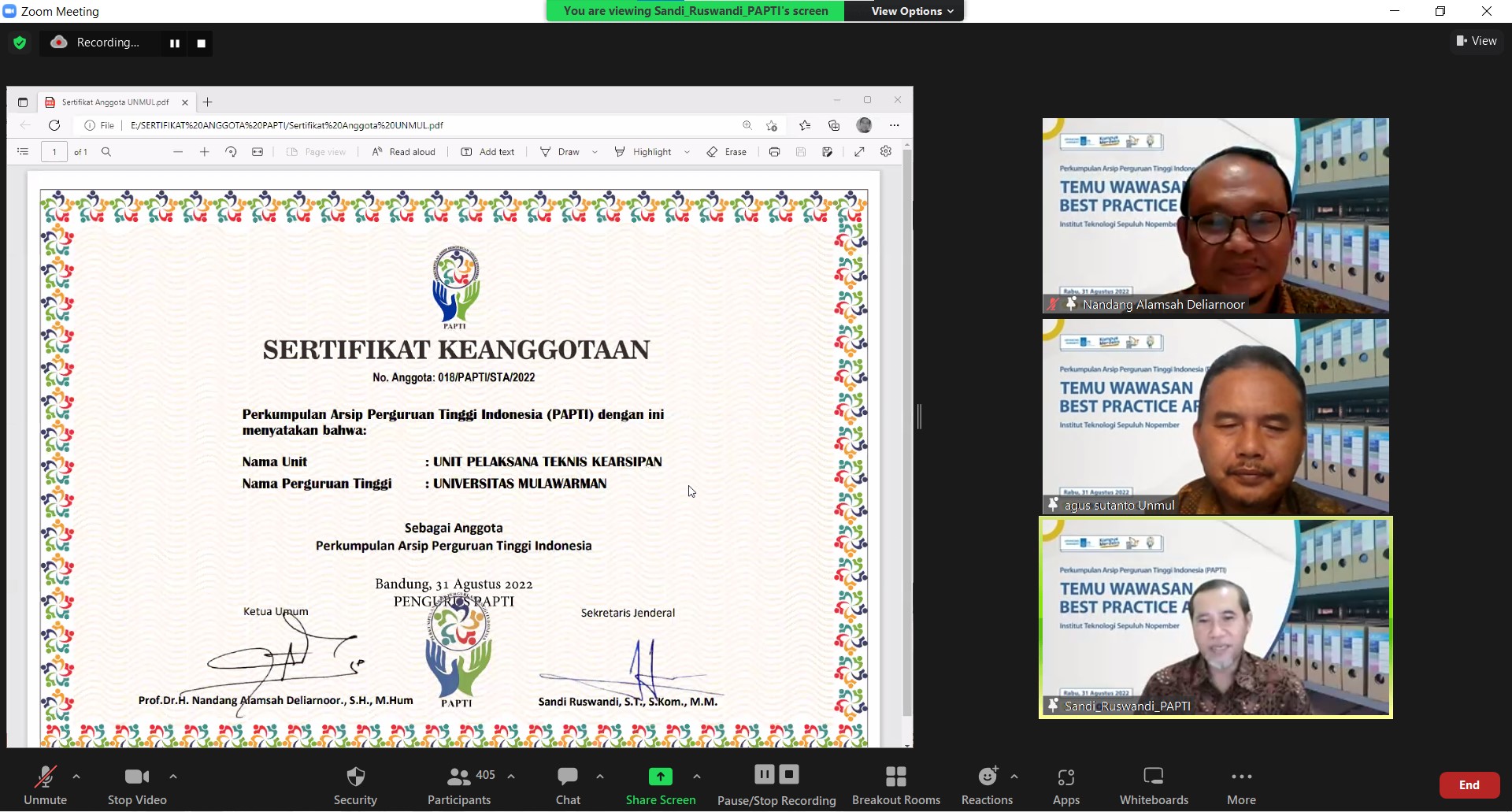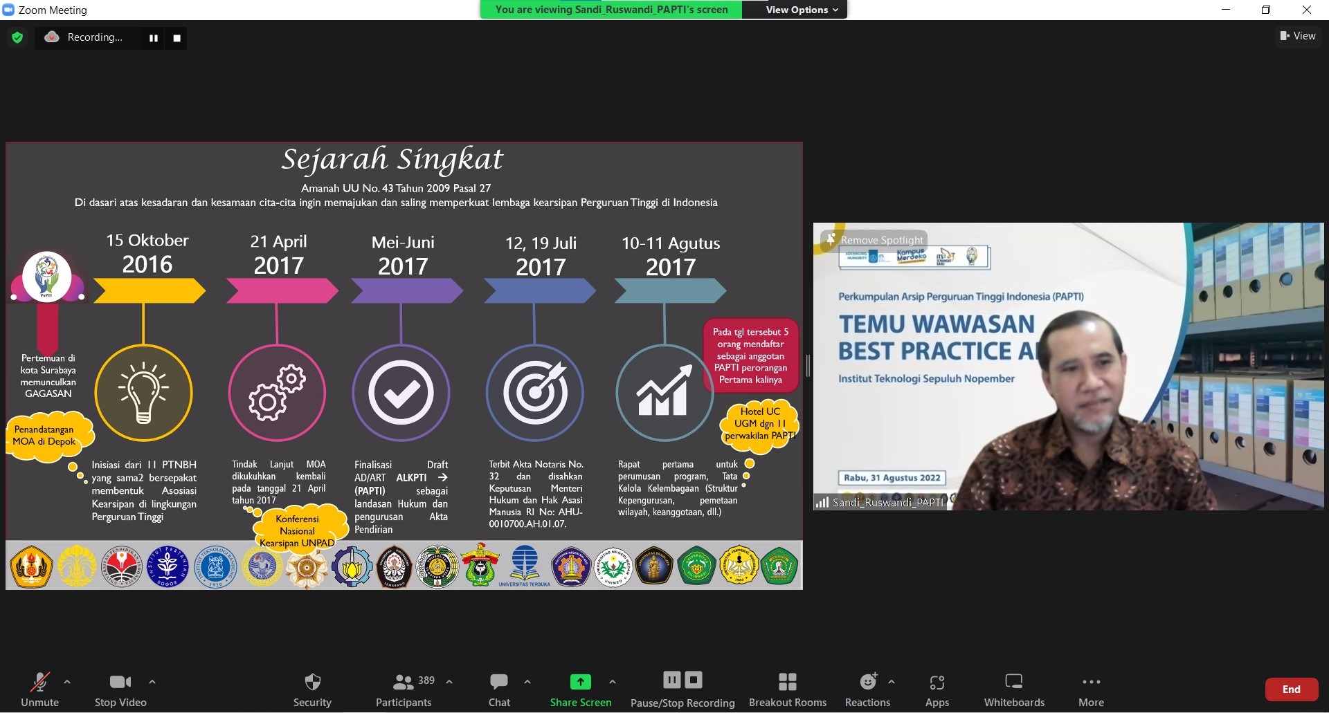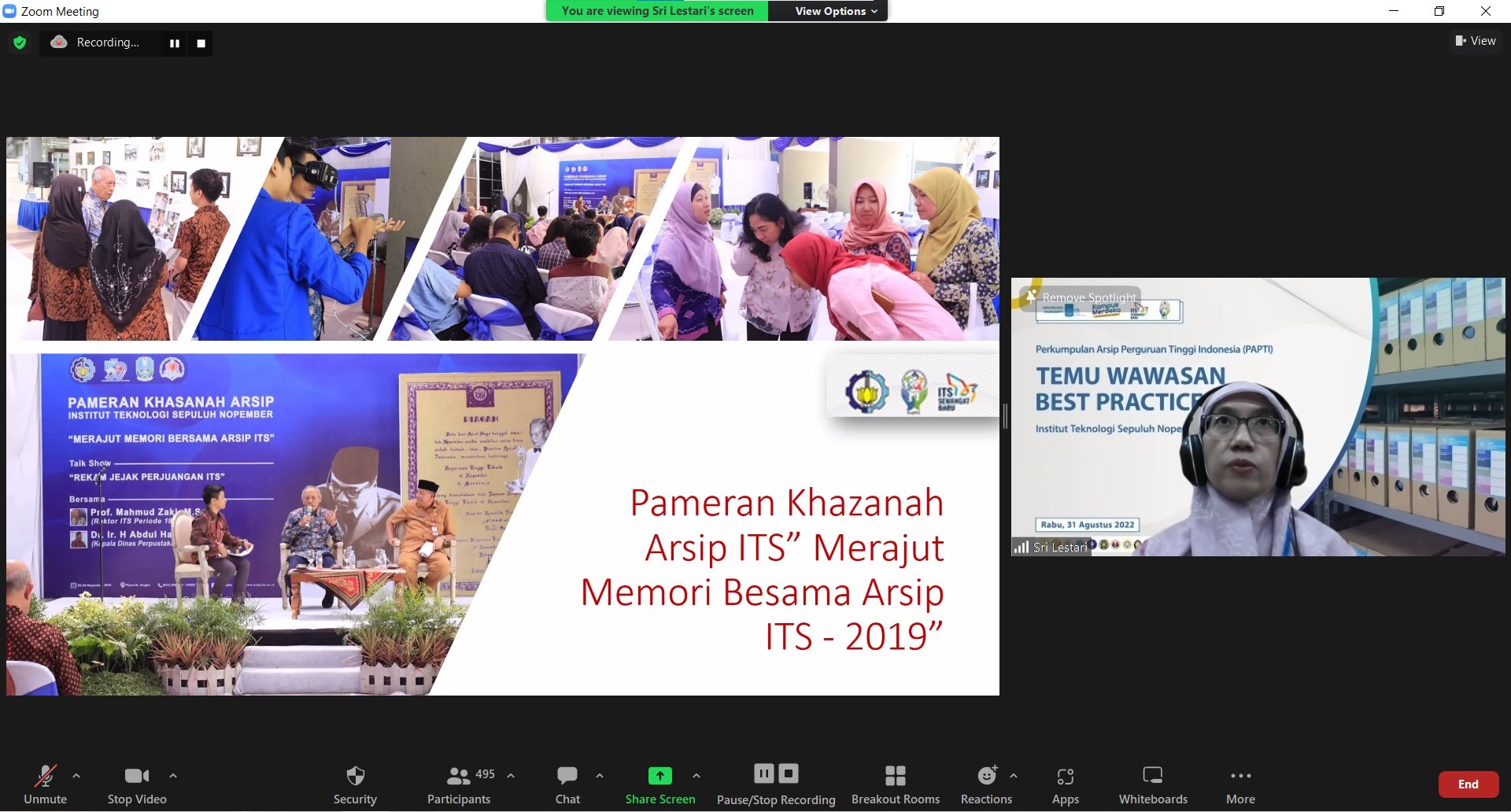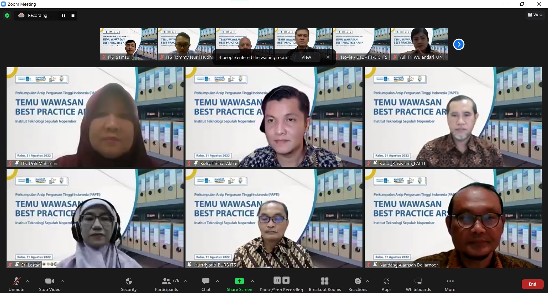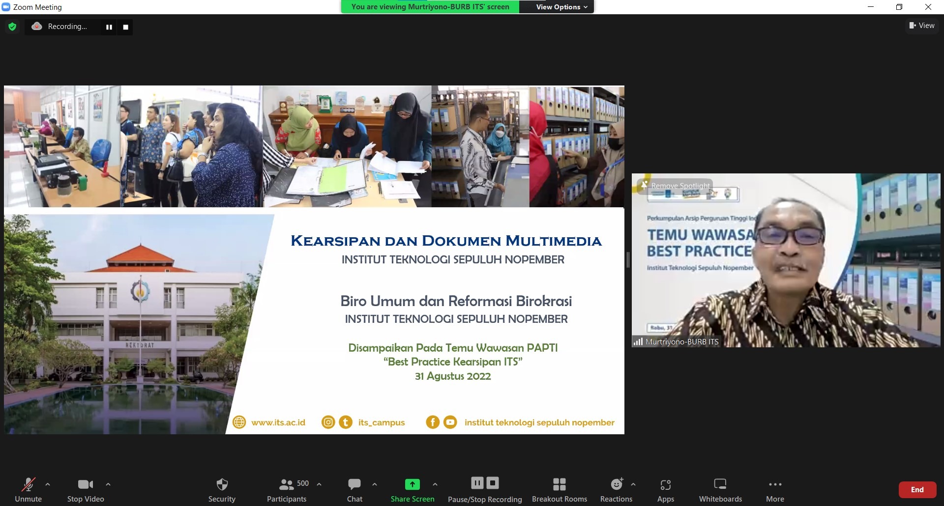 Tepat Tanggal 31 Agustus 2022 jam 09.00 Subbagian Kearsipan Dan Dokumentasi Multimedia menyelenggarakan Temu Wawasan ke 12 yag bertema “Best Pratice Arsip Universitas” melalui media Zoom Meeting. melalui kegatan ini Subbagian Kearsipan dan Dokumentasi Multimedia sharing pengetahuan dan wawasan kegiatan yang sudah dilakukan dalam mengolah arsip sesuai kaidah kearsipan dan juga tantangan teknologi dalam mengolah arsip. acara ini juga disiarkan langsung melalui kanal Youtube ITS untuk yang tidak bisa masuk media zoom meeting. pada media zoom sekitar 500 peserta yang menghadiri peserta.sungguh sangat antusias peserta dengan mengajukan banyak pertanyaan.