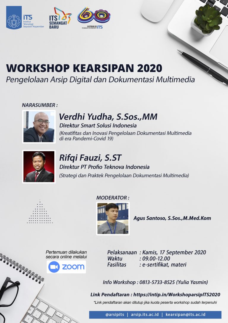 Pada tanggal 17 Oktober 2020, telah dilaksanakan kegiatan workshop “Pengelolaan Arsip Digital dan Dokumentasi Multimedia” dengan mengundang seluruh pengelola arsip di ITS dan juga dari luar ITS. Sesuai dengan