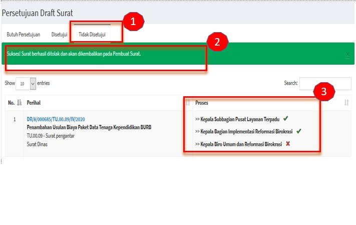 2.Bila penolakan berhasil dilakukan, maka sistem akan memberikan informasi “ sukses” sehingga akan merubag status draft surat menjadi t”tidak disetujui”
