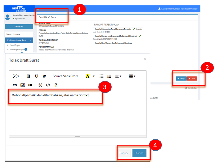 4.Apabila telah selesai, silakan klik tombol “kirim” untuk menyatakan penolakan/tidak disetujui draft surat.