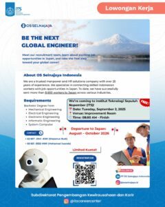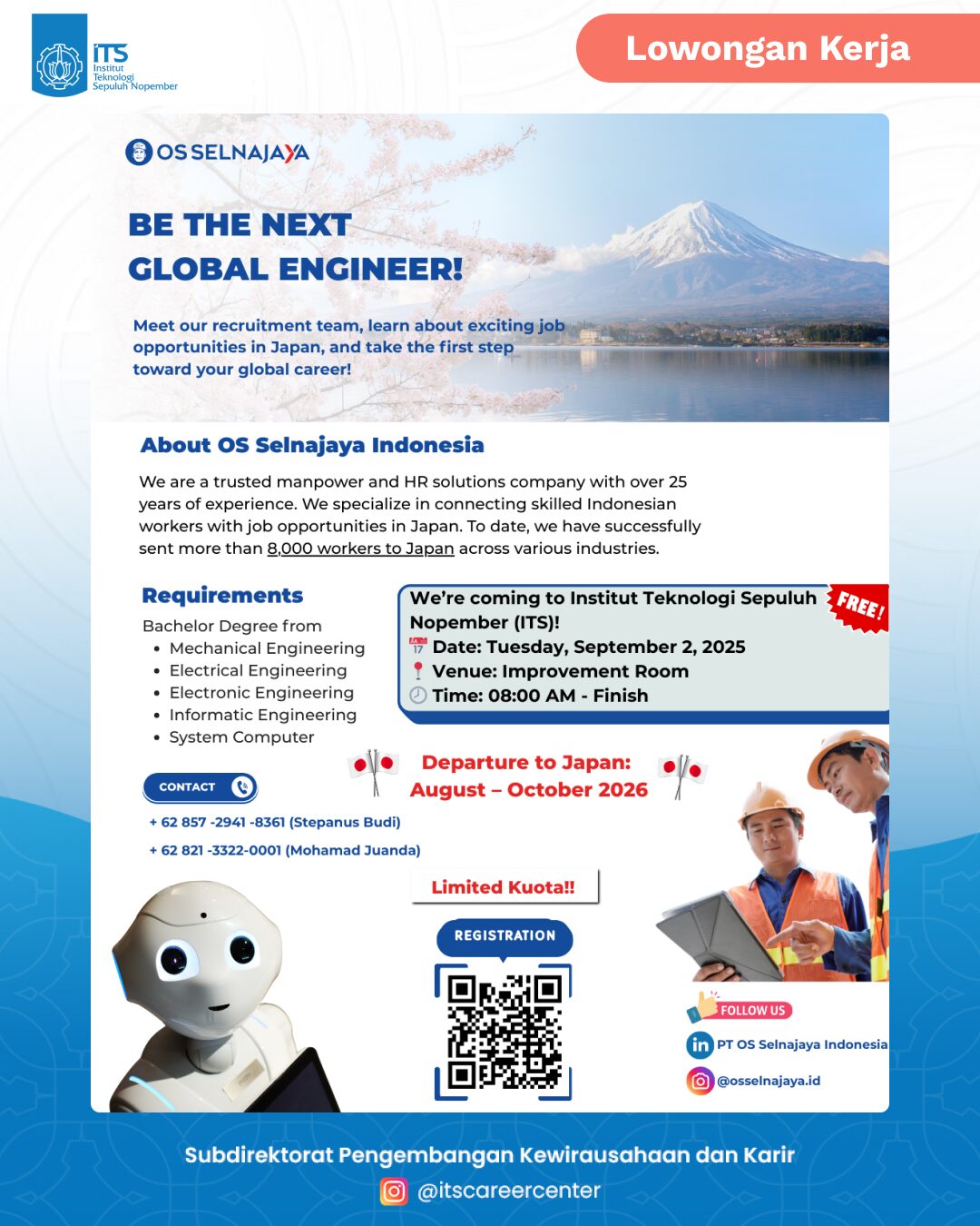 OS Selnajaya is coming to ITS Surabaya to share exciting job opportunities in Japan and the recruitment process.