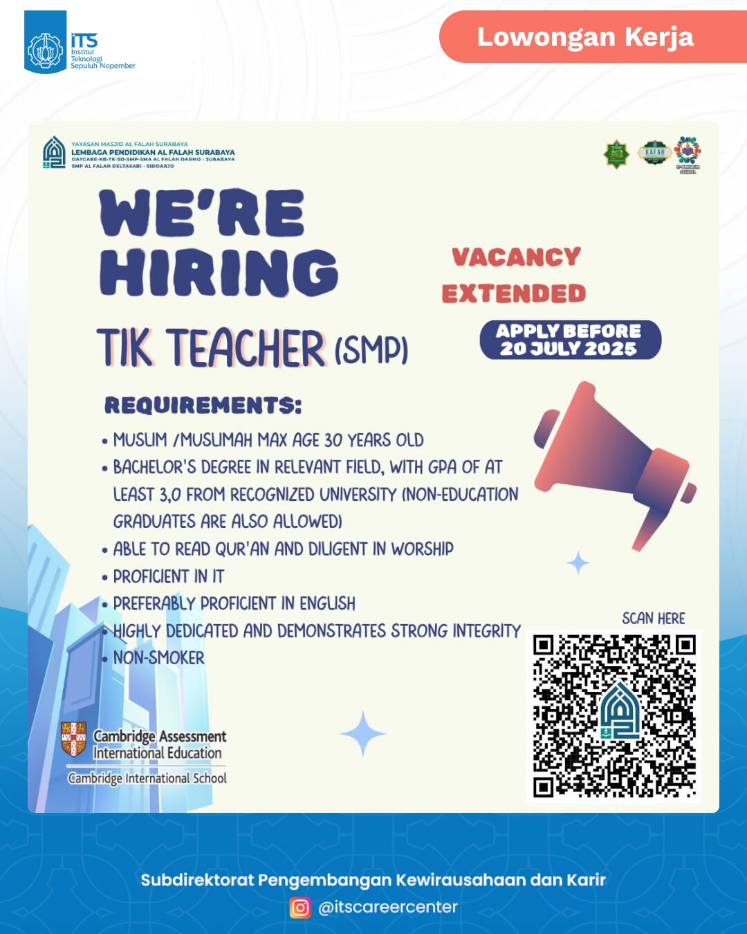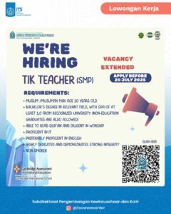 Lembaga Pendidikan Al Falah hiring, Position available: * TIK Teacher (SMP Al Falah Surabaya & SMP Al Falah Deltasari)
