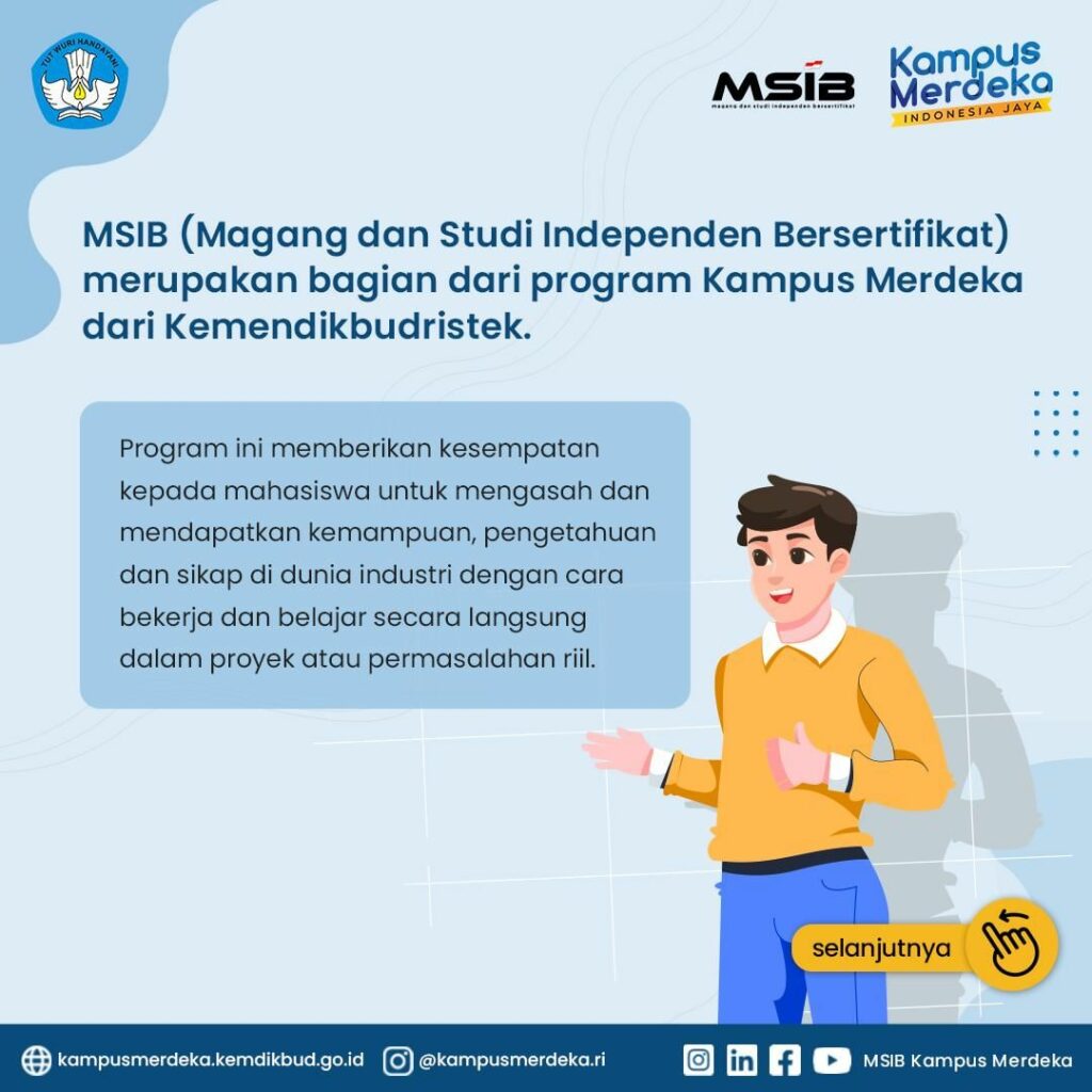 Program Magang dan Studi Independen Bersertifikat (MSIB) Kampus Merdeka memberikan kesempatan kepada mahasiswa untuk mengasah dan mendapatkan kemampuan, pengetahuan dan sikap di dunia industri dengan cara bekerja dan belajar secara langsung dalam proyek atau permasalahan riil.