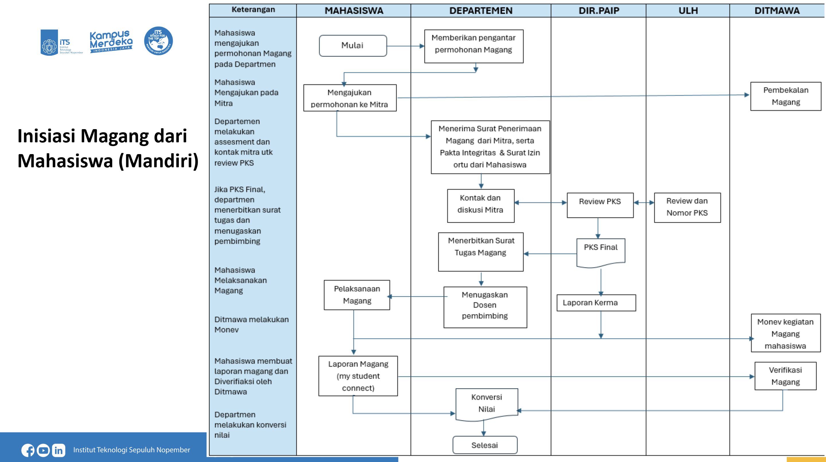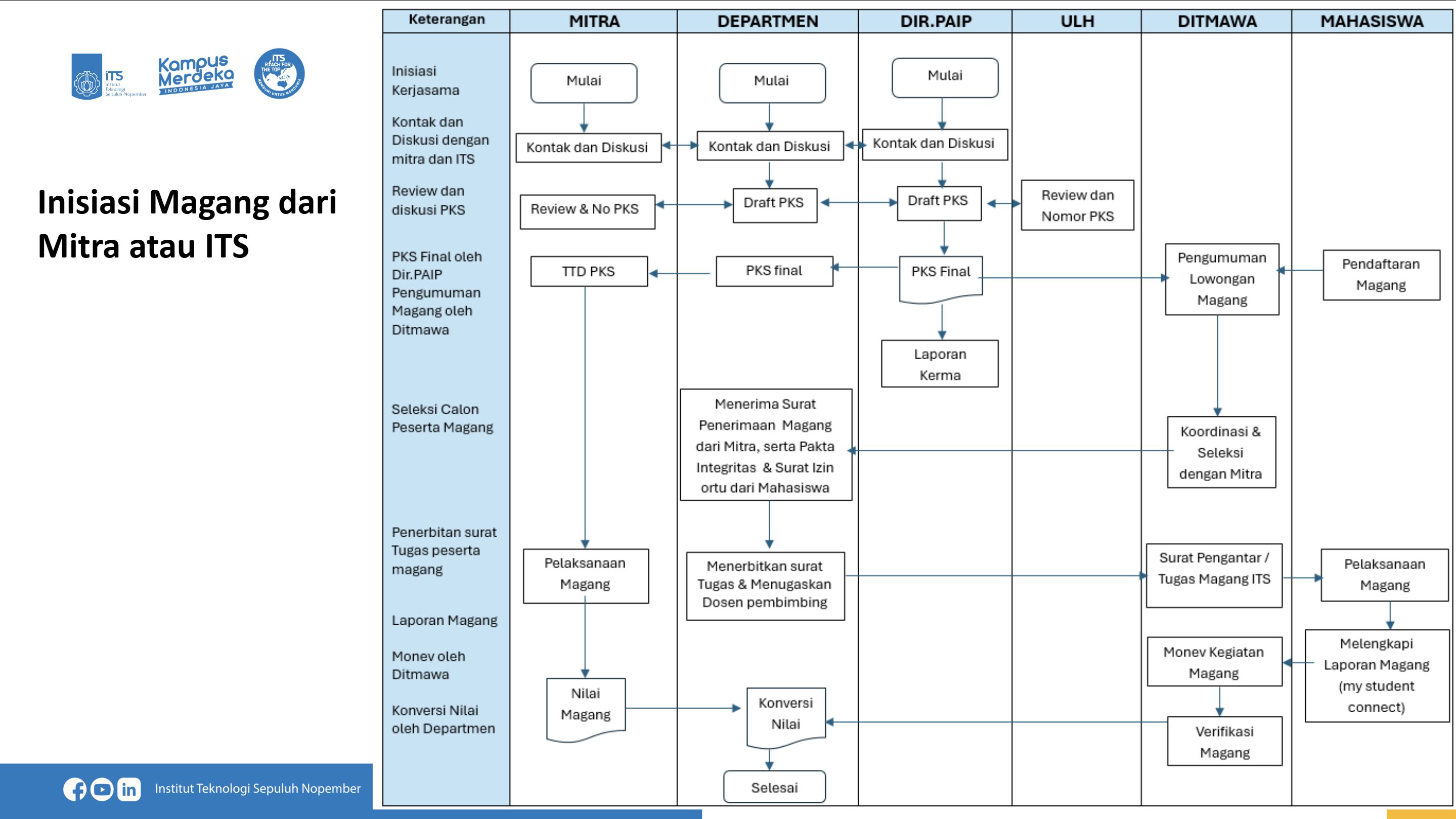 Jalur PK2 Direktorat Kemahasiswaan ITS Dimana PK2 dimungkinkan untuk melakukan inisiasi kerjasama dengan mitra magang dan atau Mitra Magang mengajukan permohonan magang melalui PK2 Direktorat Kemahasiswaan ITS.