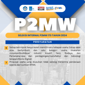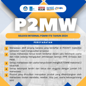 Halo, mahasiswa wirausaha ITS, bersiaplah untuk menunjukkan keahlian, kreativitas, dan semangat kewirausahaanmu melalui P2MW 2024.