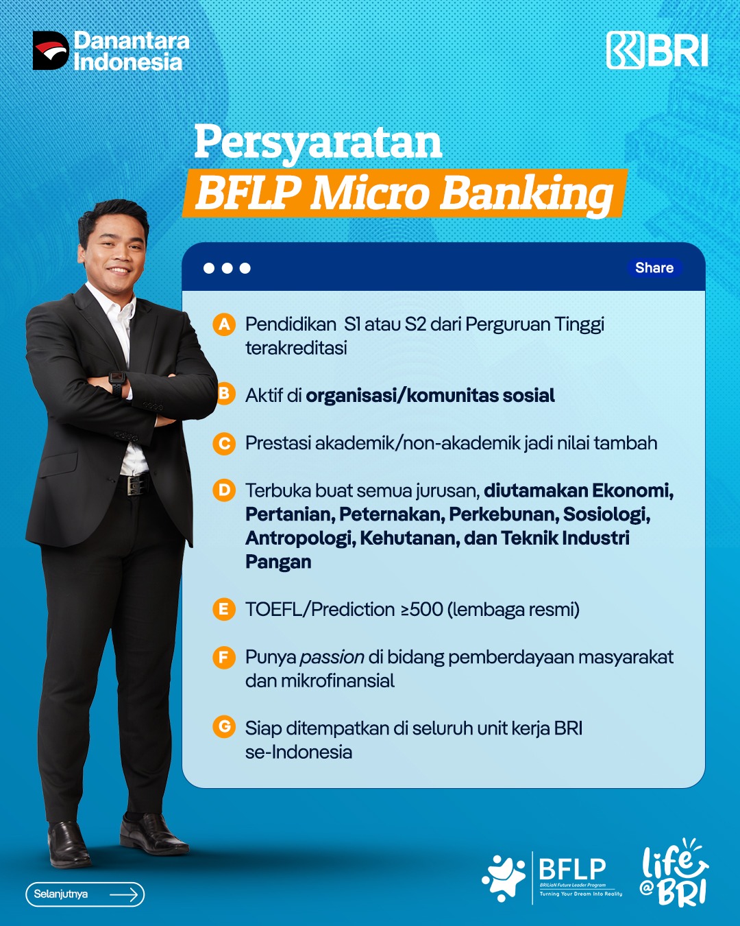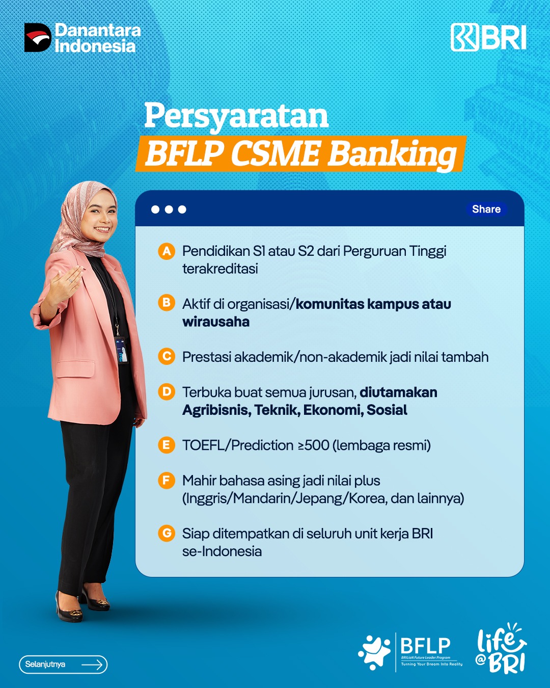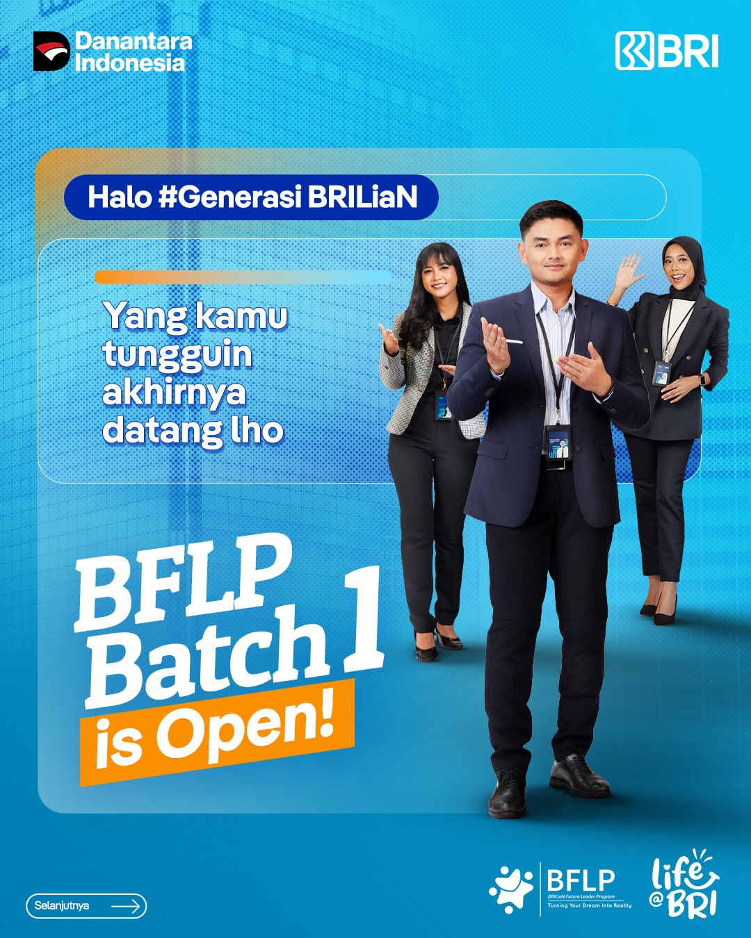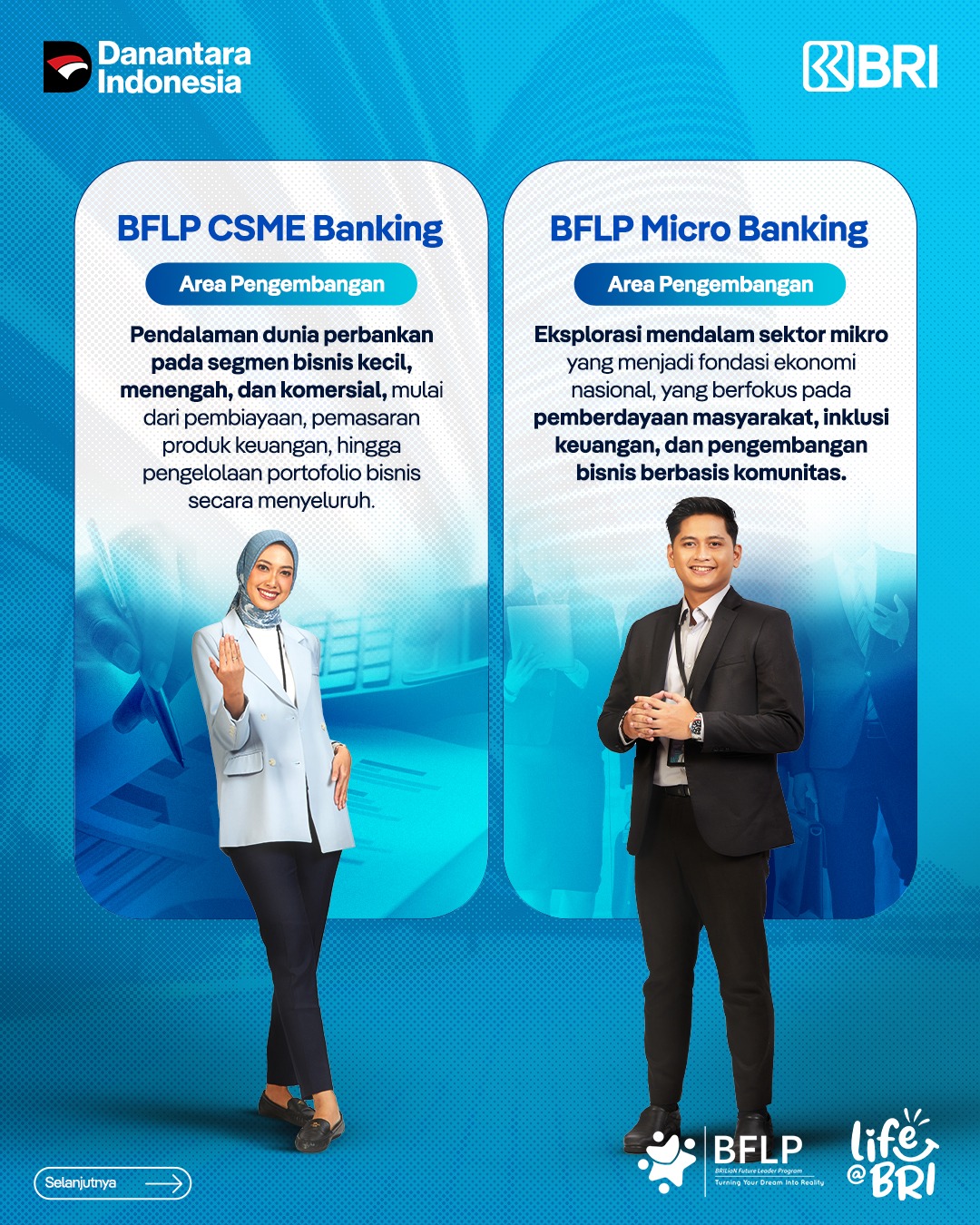 Halo Generasi BRILiaN, saat yang kamu tunggu-tunggu akhirnya datang juga! Di batch 1 ini, kamu bisa apply ke dua jalur pengembangan yaitu: 1. BFLP CSME Banking Untuk kamu yang tertarik mendalami dunia perbankan segmen bisnis kecil, menengah, dan komersial hingga pengelolaan portofolio bisnis secara menyeluruh. 2. BFLP Micro Banking Buat kamu yang passionate dalam pemberdayaan masyarakat, inklusi keuangan, dan pengembangan bisnis berbasis komunitas.
