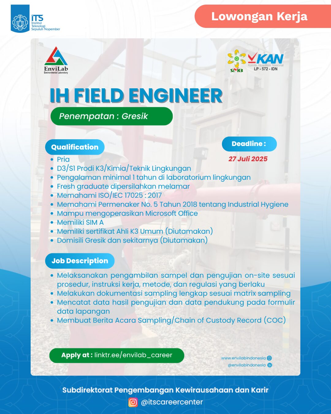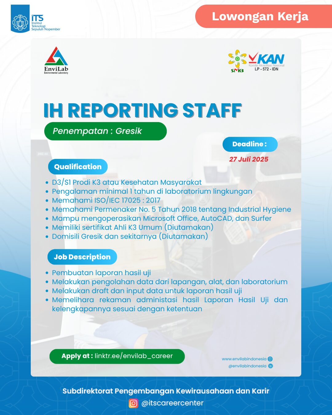 PT Envilab Indonesia sedang membuka lowongan pekerjaan untuk posisi : * IH Reporting Staff * IH Field Engineer * Admin Sales