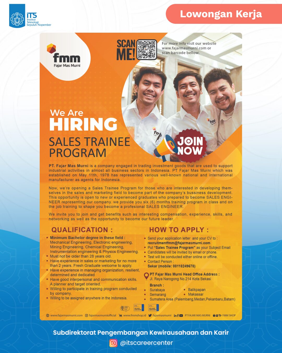 Locations: Surabaya How to Apply? Send your CV to: – recruitmentfmm@fajarmasmurni.com with subject “Sales Trainee Program”.