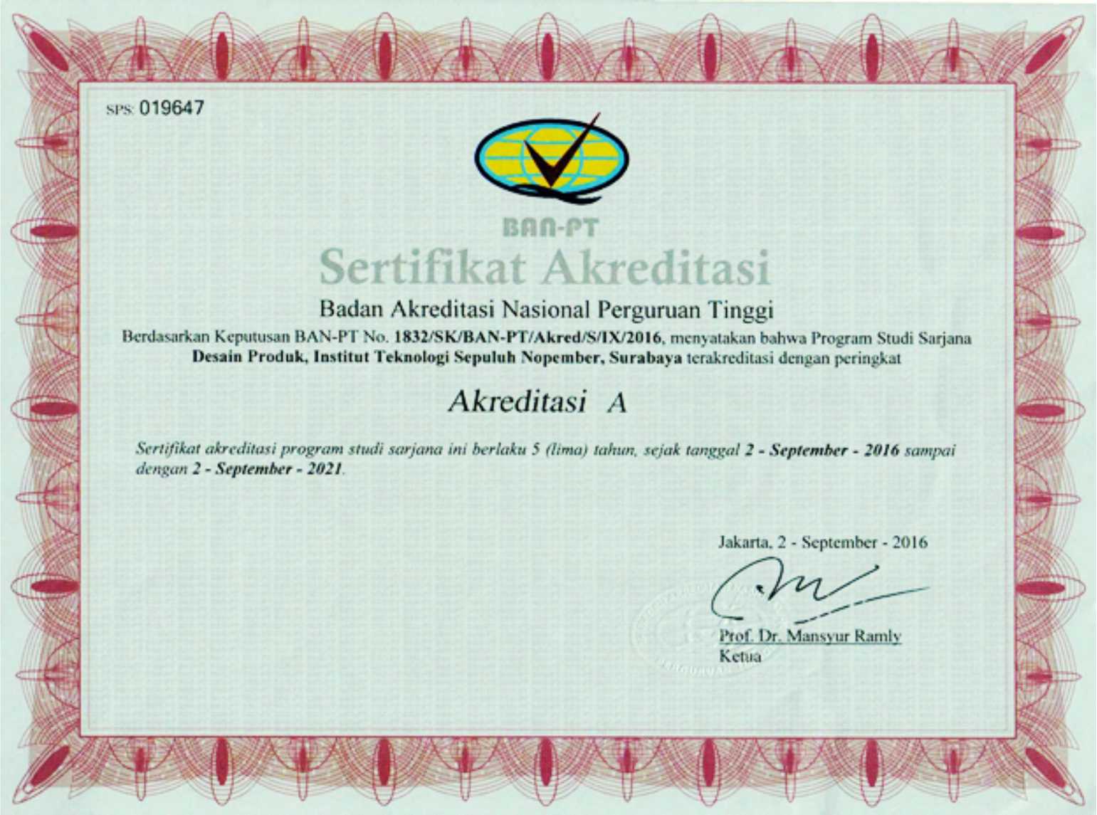SK Perpanjangan Akreditasi S1 Desain Produk(3 Sept 2021-3 Sept 2026)