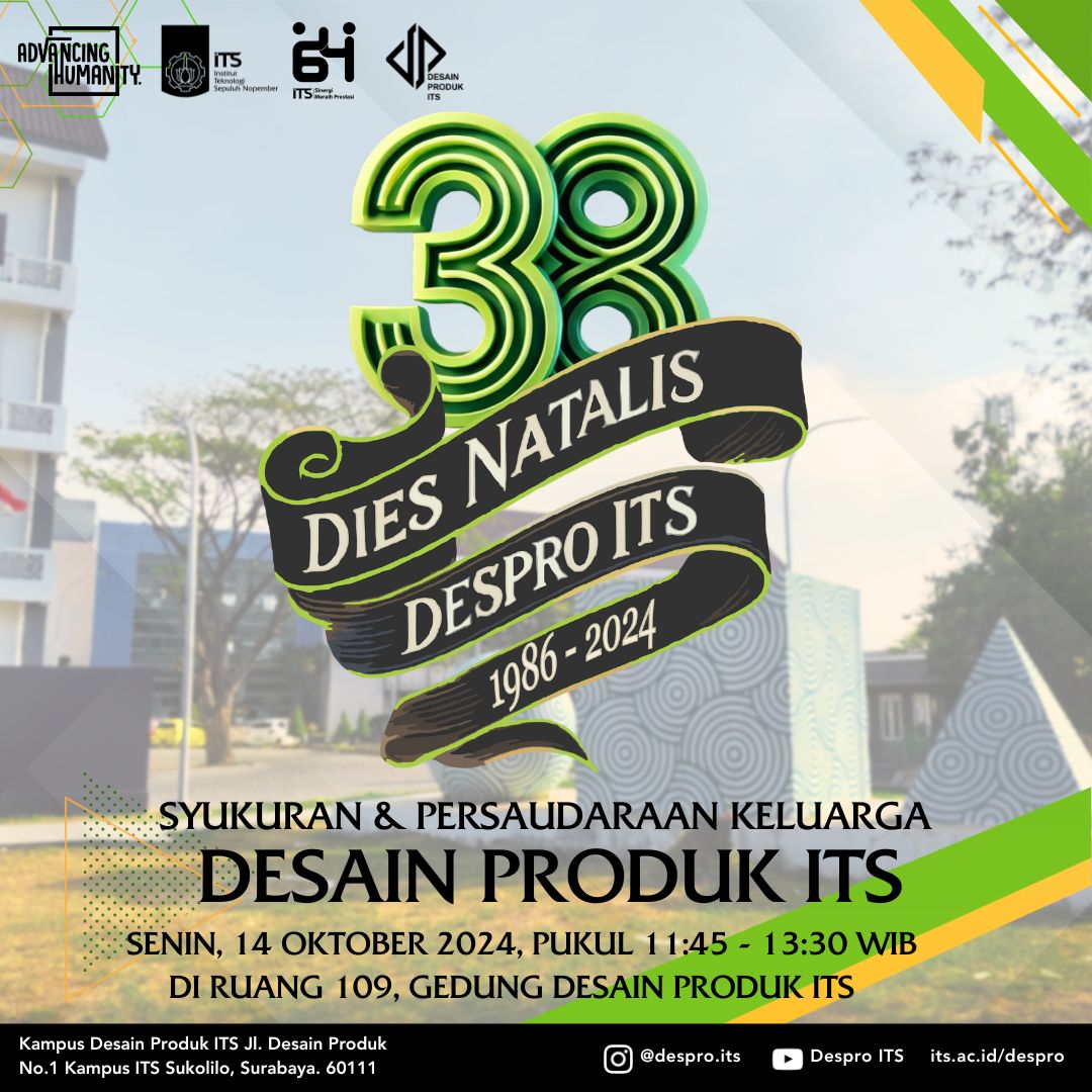 Hello, ITS Despro Family! In order to commemorate the 38th ITS Despro Anniversary, we proudly invite all academics and alumni to attend an event full of togetherness and family. Let’s gather again, strengthen the bonds of brotherhood, and commemorate this historic moment together!