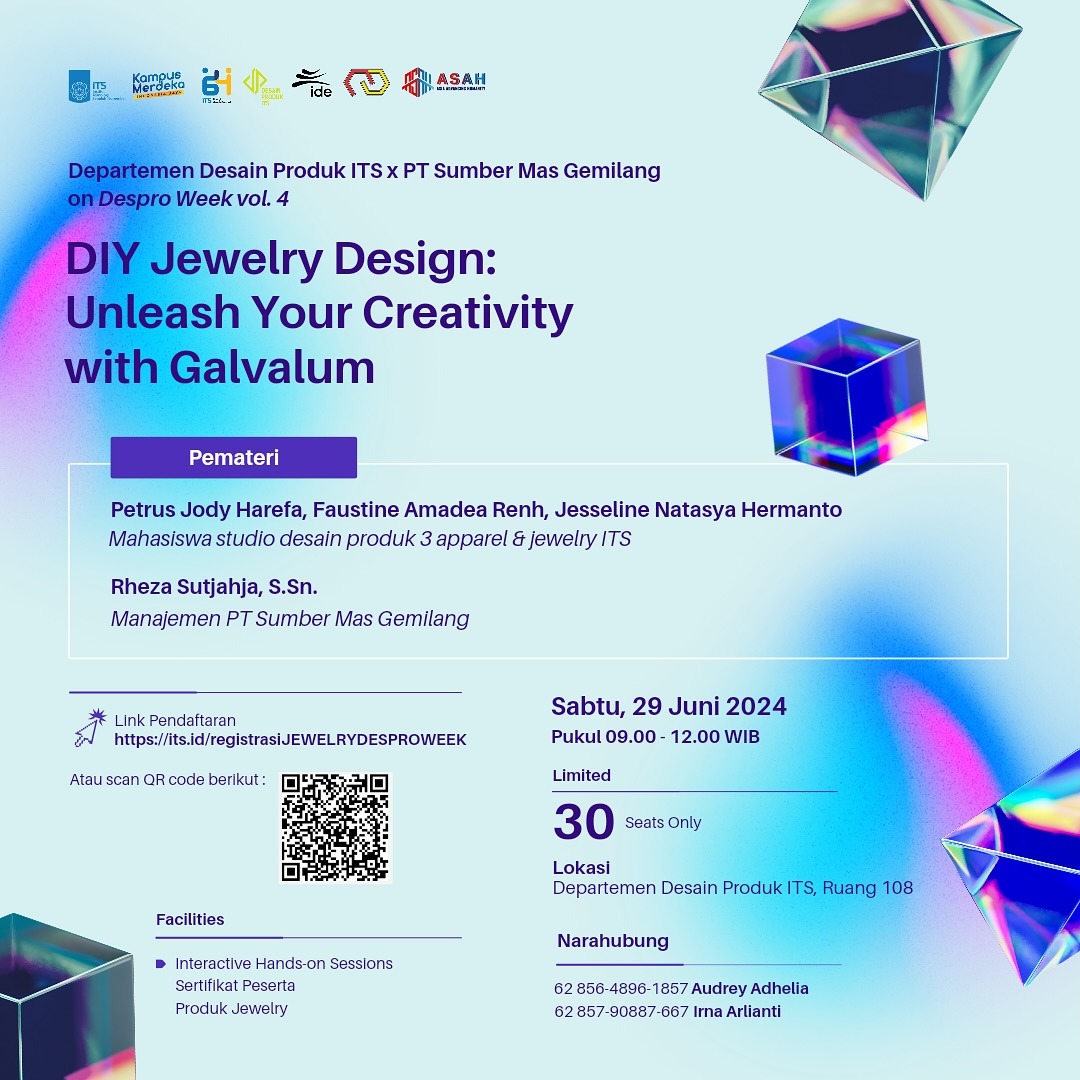 Departemen Desain Produk ITS x PT Sumber Mas Gemilang akan mengadakan Workshop DIY Jewelry Design dengan material galvalum di Despro Week Vol.4 Nanti🤩 Dengan pemateri-pemateri yang ahli di bidangnya tentunya😉✨