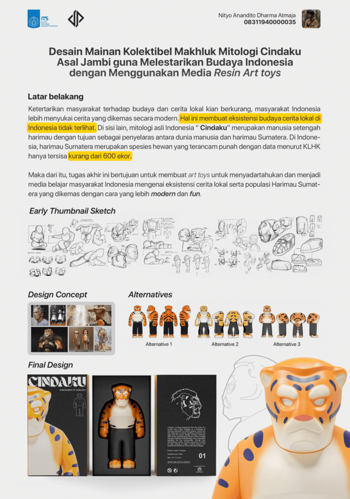 This research aims to design collectible toys based on the mythological creature Cindaku from Jambi, using resin art toys as a tool to preserve Indonesian culture. The mythological creature Cindaku holds strong historical and symbolic value in Jambi’s culture, but it is endangered due to a lack of awareness and appreciation for this cultural heritage. In this study, we will apply resin art toys design and production techniques to create toys that aesthetically visualize the characteristics of the mythological creature Cindaku. Additionally, we will examine the impact of using resin art toys as a medium on the durability and longevity of the toys, as well as assess the public’s response to the resulting products. It is expected that the findings of this research will contribute positively to the preservation of Indonesian culture through engaging and artistically valuable collectible toys.