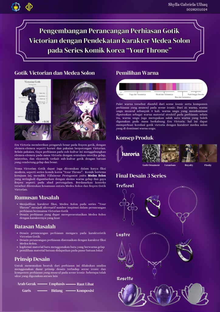 Victorian Gothic is a sub-genre of Gothic culture whose aesthetic values are inspired by the historical Victorian era, encompassing elements such as fashion, makeup, and the jewelry worn during that time. Beyond the realm of fashion, the characteristics of Victorian Gothic culture are evident in various forms, one of which is the Korean comic series titled “Your Throne.” This influence is particularly notable in the character Medea Solon, who plays the role of a Villainous Protagonist in the series. Medea Solon embodies the Victorian Gothic style through the application of color schemes and fashion choices. With the rising popularity of both Victorian Gothic aesthetics and the “Your Throne” series, there is a growing demand for media that caters to individuals’ hobbies and interests. To meet this demand, one effective approach is the creation of products that represent Victorian Gothic themes while incorporating the character of Medea Solon from the “Your Throne” comic. The envisioned product takes the form of jewelry designed with a Victorian Gothic theme, seamlessly blended with the distinctive characteristics of Medea Solon. The aim is for these pieces of jewelry to bridge both markets, serving as a means to channel the interests of enthusiasts from both Victorian Gothic culture and fans of the “Your Throne” series. It is hoped that these jewelry pieces will successfully cater to the preferences of both audiences, providing a tangible expression of their shared passions.
