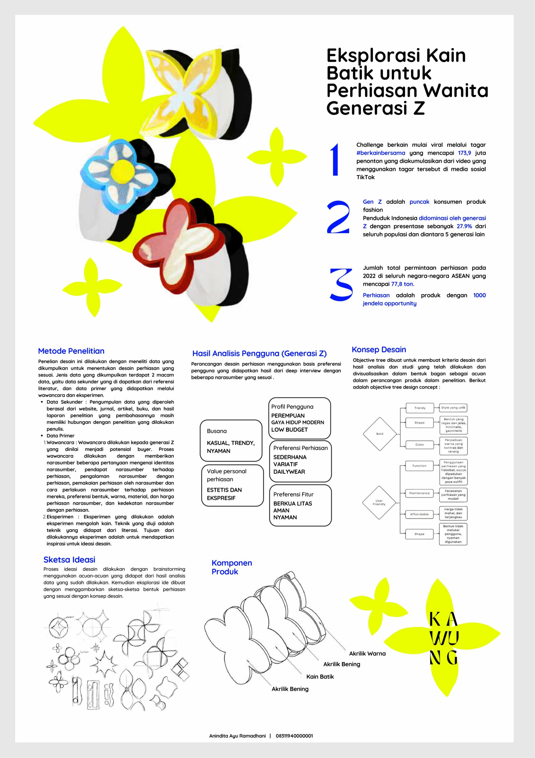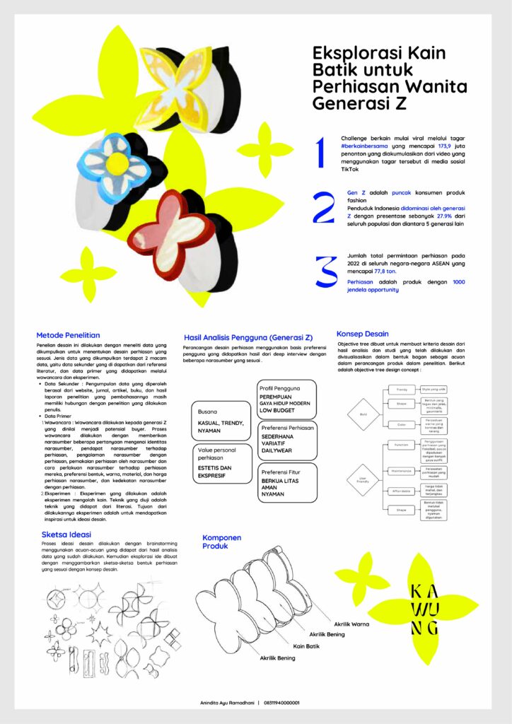 The Writer did som exploration on batik fabric with some experiments to turn batik into jewelry that suits the needs of the targeted user. The point of the experiment is alligned with the target user’s preference for jewelry. The data of the preferences from the user is obtained from study and analysis from previous research and also directly from interviewing them. From the datas gained, the writer makes the product with the research goal in mind, which is making a jewelry with batik fabric intended for generation z women.