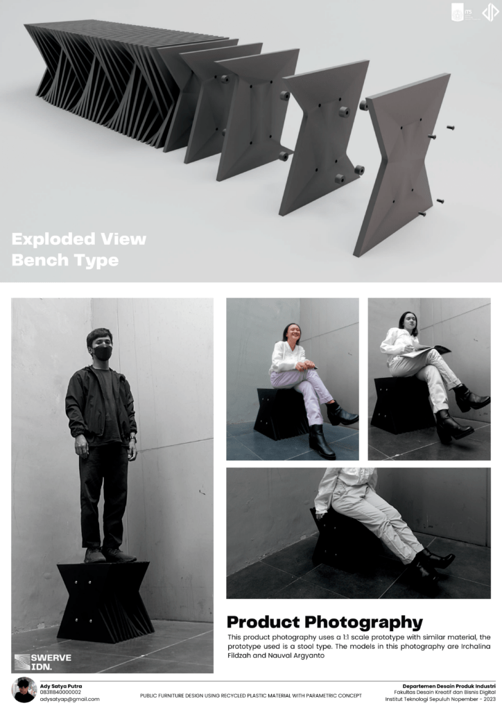 To develop public furniture products with plastic waste materials, observations were made regarding public furniture in the Surabaya area and public places such as stations and airports, material experiments to determine the physical properties of plastic waste, comparisons between existing products that utilize plastic waste, benchmarking of several furniture and user activity in public areas. From the results of the research, the authors raised the parametric concept to maximize the uptake of plastic waste in one product. The results of this study are furniture designs in the form of sitting facilities with parametric concepts for public spaces. One panel weighs 2 kg, so this design can absorb HDPE plastic waste with a total weight of 80 kilograms.