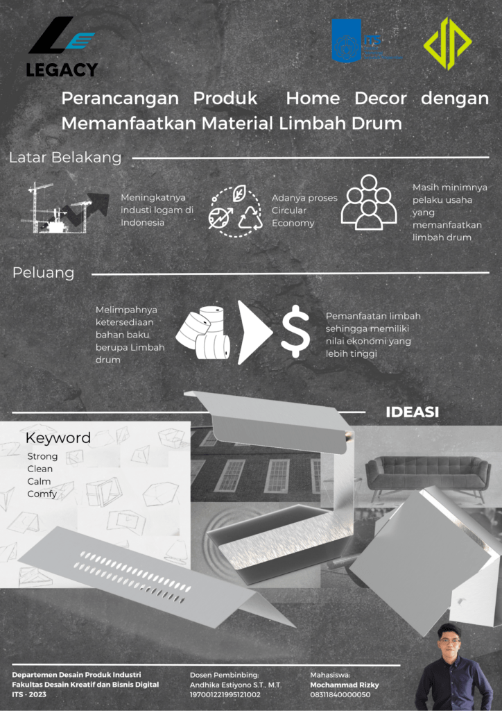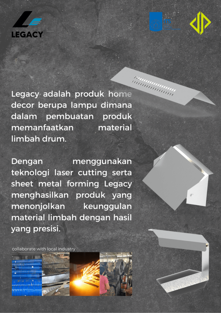 The growth of the metal industry always increases every year. Based on PODES (2018), in 2014-2018 it was recorded that metal MSEs in Indonesia had increased by 1397 units. This growth was dominated by several sectors, including crafts, jewelry, and household appliances. Until 2021 the metal industry will grow by 3.54% (Ministry of Industry of the Republic of Indonesia 2021). This increase is also in line with the high demand for metal manufacturing in Indonesia. Judging from the height the growth of the metal industry there is potential from the availability of used drum waste. Given the price of drum waste which is more affordable than new material. The availability of raw materials is abundant and it would be a shame to throw them away given the high number of metal business actors in Indonesia. By using metal sheet metal forming processing techniques in order to be able to utilize drum waste material into products with high selling power. Opportunities in the utilization of waste materials are quite high which is in line with the circular economy concept so that these materials can become sustainable materials that help protect the environment. Some research and experiments are needed to determine the nature and proper treatment in drum waste material processing and obtain optimal results. At the end of the study, it was found that the types of products designed were: wall lamps, table lamps, and pendant lamps.