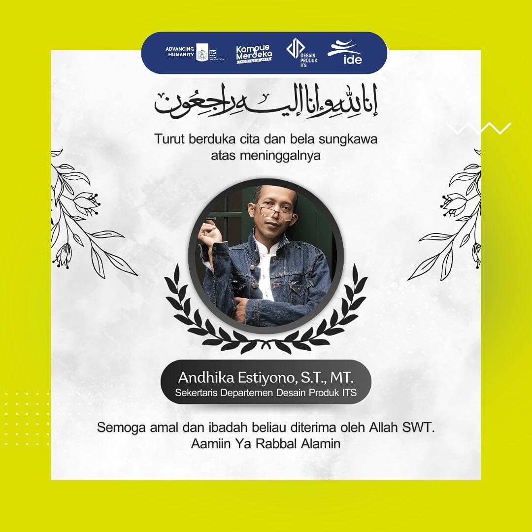 Innalillahi wa innailaihi rojiun. Allahummaghfirlahu warhamha waafiha wafuanha Telah meninggal dunia dosen Departemen Desain Produk Industri ITS “Bapak Andhika Estiyono, S.T., M.T.” Semoga Allah SWT menerima amal ibadahnya dan mengapuni dosanya. Serta keluarga yang ditinggalkan diberikan kesabaran dan ketabahan. Amin ya robbal alamin…