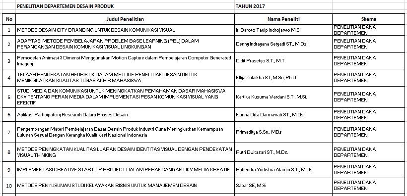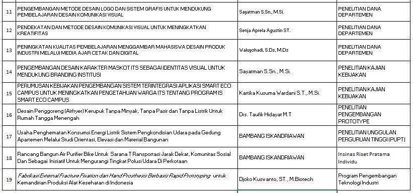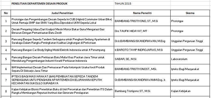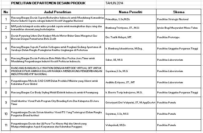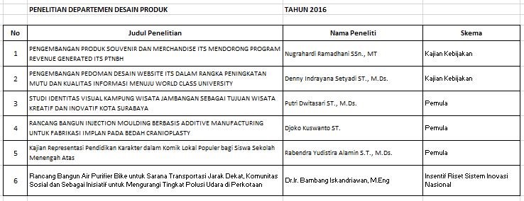 Topik penelitian yang telah dilaksanakan oleh Departemen Desain Produk Institut Teknologi Sepuluh Nopember Surabaya dalam 5 tahun terakhir adalah sebagai berikut :