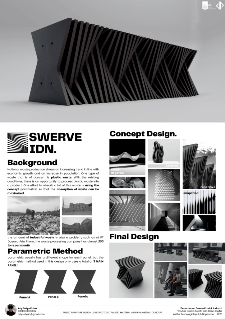 Untuk mengembangkan produk public furniture dengan material limbah plastikdilakukan observasi mengenai public furniture yang ada di area Surabaya dan tempat umum seperti stasiun dan bandara, eksperimen material untuk mengetahui sifat fisik dari limbah plastik, membandingan antara produk eksisting yang memanfaatkan limbah plastik, benchmarking dari beberapa furniture dan aktivitas pengguna yang ada di area publik. Dari hasil penelitian penulis mengangkat konsep parametric untuk memaksimalkan serapan limbah plastik dalam satu produk. Hasil penelitian ini adalah desain furniture berbentuk fasilitas duduk dengan konsep parametrik untuk ruang publik. Satu Panel memiliki berat 2 Kg, jadi perancangan ini dapat menyerap sampah plastik jenis HDPE dengan bobot total sebanyak 80 kilogram.