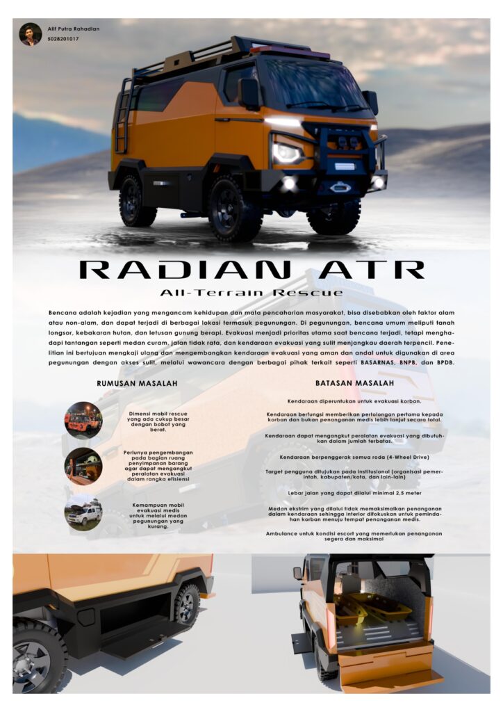 Bencana adalah peristiwa atau rangkaian peristiwa yang mengancam dan mengganggu kehidupan dan penghidupan masyarakat yang disebabkan oleh faktor alam dan/atau faktor nonalam sehingga merugikan bagi manusia maupun lingkungan sekitar. Bencana dapat terjadi di manapun termasuk di daerah pegunungan. Bencana yang umunya terjadi di daerah pegunungan adalah tanah longsor, kebakaran lahan dan hutan, serta letusan gunung berapi. Evakuasi manusia dan juga lingkungan sekitar merupakan prioritas utama ketika terjadi bencana. Namun, evakuasi manusia dan lingkungan yang terdampak bencana terutama di daerah pegunungan memiliki beberapa tantangan yang dihadapi. Beberapa diantaranya adalah medan pegunungan yang curam, jalanan yang tidak rata, serta kemampuan kendaraan evakuasi yang sulit untuk menanjak ketika di pegunungan. Kendaraan evakuasi eksisting sulit untuk mencapai daerah terpencil dengan akses jalan yang minim. Penelitian ini bertujuan untuk mengkaji ulang kendaraan evakuasi yang ada, kemudian merancang dan mengembangkan kendaraan evakuasi yang aman, andal, serta dapat membantu evakuasi bencana terutama di area pegunungan dengan akses yang sulit. Metode penelitian yang digunakan adalah pengolahan data primer yang didapatkan melalui wawancara dengan pihak-pihak yang terkait dalam aktivitas evakuasi bencana seperti BASARNAS (sekarang BNPP), BNPB, BPDB, dan Pemadam Kebakaran. Penelitian ini didukung juga dengan data sekunder dari literatur terkait. Hasil akhir dari penelitian ini antara lain laporan, portofolio, gambar teknis, gambar presentasi, dan model terskala yang mendukung pengembangan moda transportasi ini kedepannya.