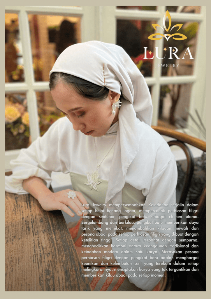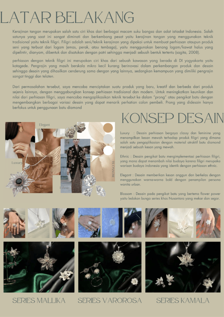 Filigri kini menjadi salah satu kerajinan tangan yang banyak diminati di industri kreatif. Filigri adalah teknik seni dan kerajinan kuno yang menarik perhatian masyarakat karena keindahan dan kehalusan karyanya. Namun, desain filigri saat ini dianggap monoton dan hanya digunakan sebagai pengisi perhiasan filigri. Tujuan dari penelitian ini adalah untuk membuat perhiasan lain selain yang umum dibuat dengan membuat pengikat batu sebagai material atraktif dengan memadukan keindahan konsep diamond prong dengan teknik filigri. Penelitian dimulai dengan menganalisis artefak menggunakan metode “Muse” untuk mendeskripsikan perilaku dan gaya hidup pengguna. Eksperimen kemudian dilakukan dengan bahan logam serupa untuk menemukan teknik pengikatan batu mana yang dapat digunakan tergantung pada permukaan dan kekuatan batu. Data yang diperoleh menunjukkan 5 motif dasar yang diterapkan pada produk yang halus. Metode yang dianalisis menghasilkan konsep desain, “Flower Power”, yang berfungsi sebagai panduan untuk membuat papan suasana hati dengan mengumpulkan gambar, foto, bahan, tema, dan warna yang sesuai untuk menentukan bentuk dan hiasan pengikat batu.