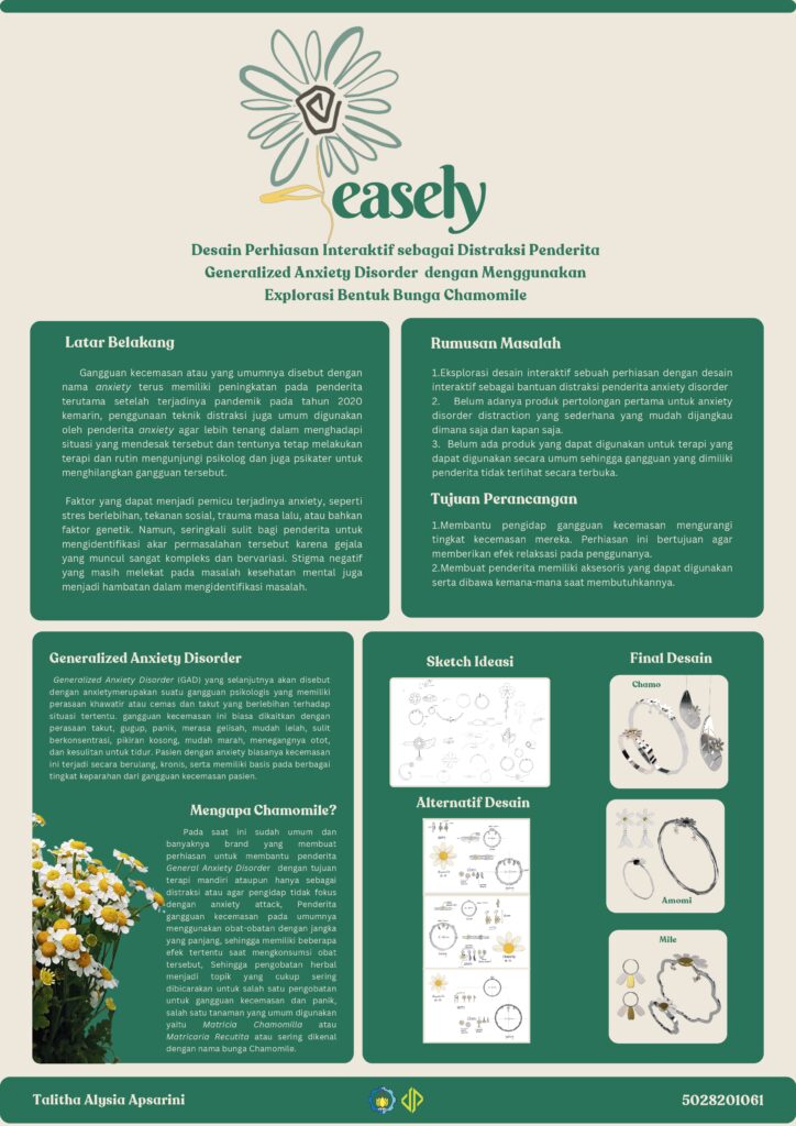 Permasalahan terhadap gangguan mental terutama gangguan kecemasan yang umum dialami oleh remaja terutama pada tahun 2020 saat pandemi menyerang membuat meningkatnya kasus bunuh diri dikarenakan adanya gangguan mental yang terlalu lama dipendam sehingga membuat gangguan tersebut mulai mengganggu kehidupan sehari-hari penderita. Perancangan perhiasan interaktif dengan konsep nature, psychological dan calming ini dibuat untuk membantu penderita dalam situasi gangguan agar terdistraksi dengan harapan mengurangi kecemasan yang melanda user, dan juga bertujuan agar tidak menunjukkan bahwa penderita memiliki penyakit mental yang menyebabkan penderita merasa tidak nyaman dengan dilakukan observasi dan studi perilaku terhadap penderita sebagai acuan dalam merancang perhiasan ini dengan value yang membuat penderita tertarik dalam penggunaan perhiasan interaktif yang akan dirancang.