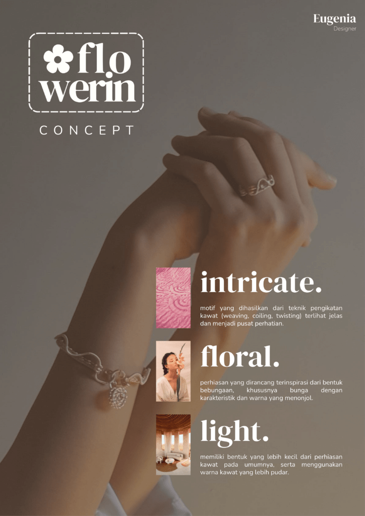 Salah satu cara untuk menarik minat generasi tersebut adalah dengan menyesuaikan dengan tren yang sedang populer di kalangan tersebut, salah satunya berupa tren perhiasan yang menggunakan konsep floral. Berkaitan dengan gaya desain klasik pada perhiasan kawat yang cenderung berukuran besar, maka konsep light disematkan dengan harapan membuat perhiasan terkesan ringan bagi pengguna. Kedua konsep itu akan ditambahkan dalam perancangan tanpa menghilangkan esensi dari perhiasan kawat sendiri, yaitu konsep intricate. Dengan begitu, harapannya adalah perhiasan kawat dapat menjadi perhiasan yang eksis di kalangan muda