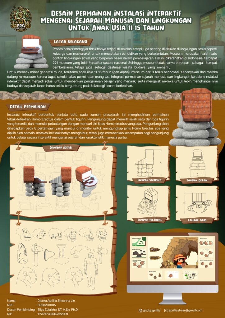 Museum seringkali dimanfaatkan sebagai tempat belajar diluar sekolah yang berkelanjutan serta konvergen dengan alam dan lingkungan sosial. Di Indonesia sendiri museum yang memiliki status terakreditasi sudah ada sebanyak 291 yang tersebar di berbagai kawasan di Indonesia. Salah satu museum yang besar dan populer di Jakarta adalah Museum Nasional dengan jumlah pengunjung sebanyak 523.141 pada tahun 2022 dan terus meningkat hingga kini. Sebagian besar pengunjung yang banyak ini berasal dari rombongan siswa yang melakukan pembelajaran di luar kelas. Tidak banyak pengunjung non rombongan yang datang secara khusus untuk mempelajari sejarah secara pribadi terutama anak berusia 11-15 tahun atau biasa disebut generasi Alfa. Pengunjung memiliki ketertarikan terhadap hal-hal yang berhubungan dengan kemajuan teknologi, sehingga menciptakan suasana yang lebih menyenangkan. Museum haruslah berperan aktif dalam menarik pengunjung anak, salah satunya dengan membuat instalasi interaktif yang menarik perhatian. Desain instalasi interaktif dapat memanfaatkan penggunaan seluruh panca indera yang membantu dalam proses pembelajaran mengenai nilai-nilai proses kehidupan sejarah manusia dan lingkungan secara cepat dan lebih berkesan. Metode penelitian dilakukan melalui proses analisis produk-produk yang sudah ada, mengetahui target konsumen dan pembelajaran yang sesuai agar tepat guna, brainstorming ide-ide permainan yang menarik, proses pengujian produk, hingga pembuatan model, dan diujikan kembali kepada pengguna. Sehingga terbentuklah instalasi gua dan instalasi figurin Homo Erectus yang dibuat dengan memaksimalkan interaksi pengguna dengan menggabungkan indera peraba, penglihatan, pendengaran, serta penciuman dan teknologi permainan.