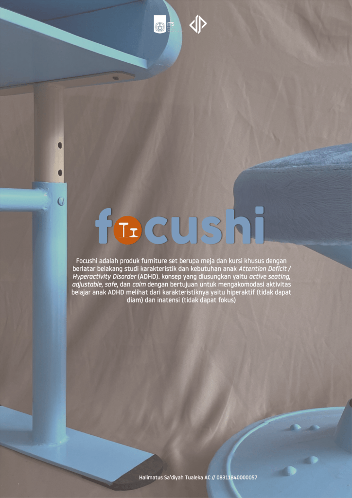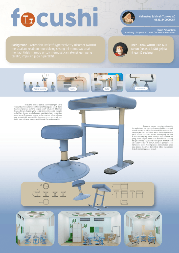Attention-Deficit / Hyperactiviy Disorder (ADHD) merupakan salah satu gangguan neurobiologi berupa ketidakmampuan memusatkan perhatian, mudah teralih, impulsif, dan hiperaktif. Anak dengan ADHD biasa bersifat agresif, penuh semangat, tidak dapat tenang, sulit diajar, dan tidak tahan lama atau susah fokus saat melakukan suatu aktivitas. Dengan ini anak ADHD membutuhkan perlakuan, penanganan khusus, serta sarana dan prasarana yang sesuai dengan anak penyandang ADHD. Salah satu sarana khusus yang terlihat signifikan dengan sarana normal lain yaitu bangku belajar yang dirancang untuk anak ADHD. Bangku belajar sendiri merupakan sarana yang perlu diperhatikan karena merupakan furniture yang sering berinteraksi dengan anak ADHD dalam jangka waktu yang lama. Pertimbangan baiknya suatu desain yaitu terpenuhinya kebutuhan yang dapat menyesuaikan kondisi pengguna. Untuk mendapatkan solusi dilakukan wawancara dengan ahli, calon pengguna berupa anak ADHD usia 6-9 tahun, studi tentang ADHD, active seating, fidgeting, ergonomi, warna, benchmarking terhadap eksisting, dan analisa pengguna.